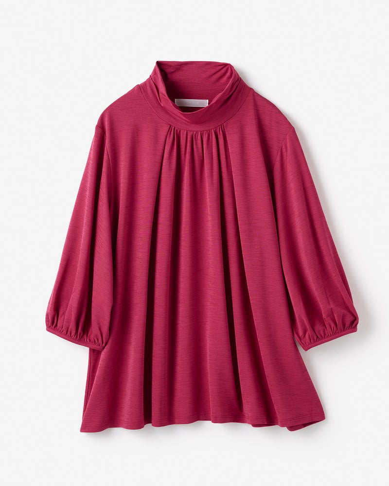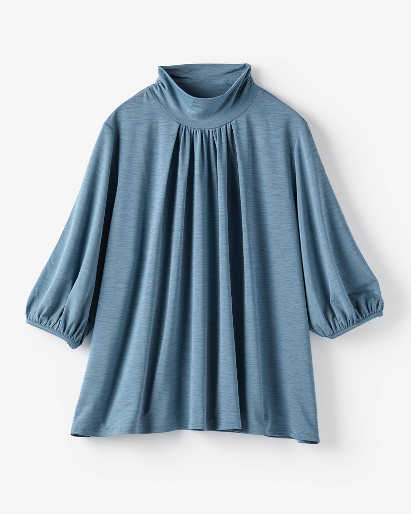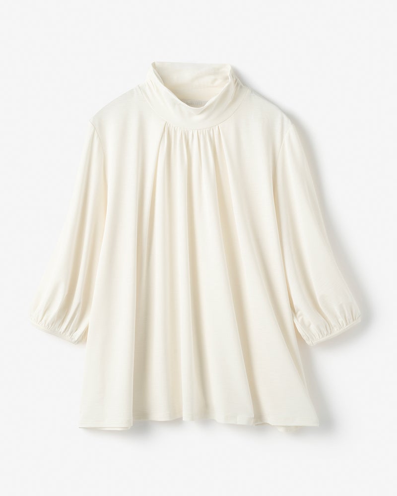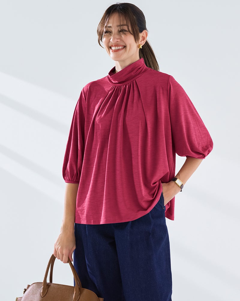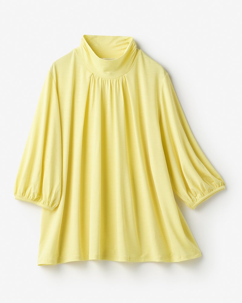 紫外線を90%以上カットする機能派カットソー、UVスラブのプルオーバーブラウス。首もとの日焼けを防ぎながら、顔印象も映えるギャザーハイネック。ギャザーから流れるふんわりしたフレアシルエットが、ボディラインをカバーしながらエレガントに。