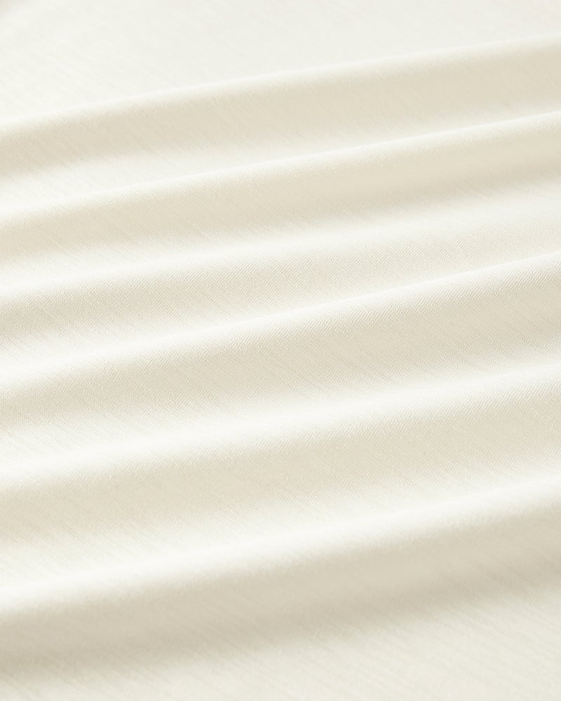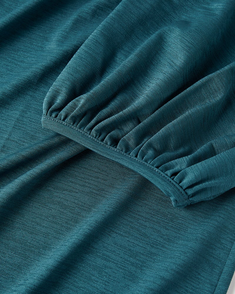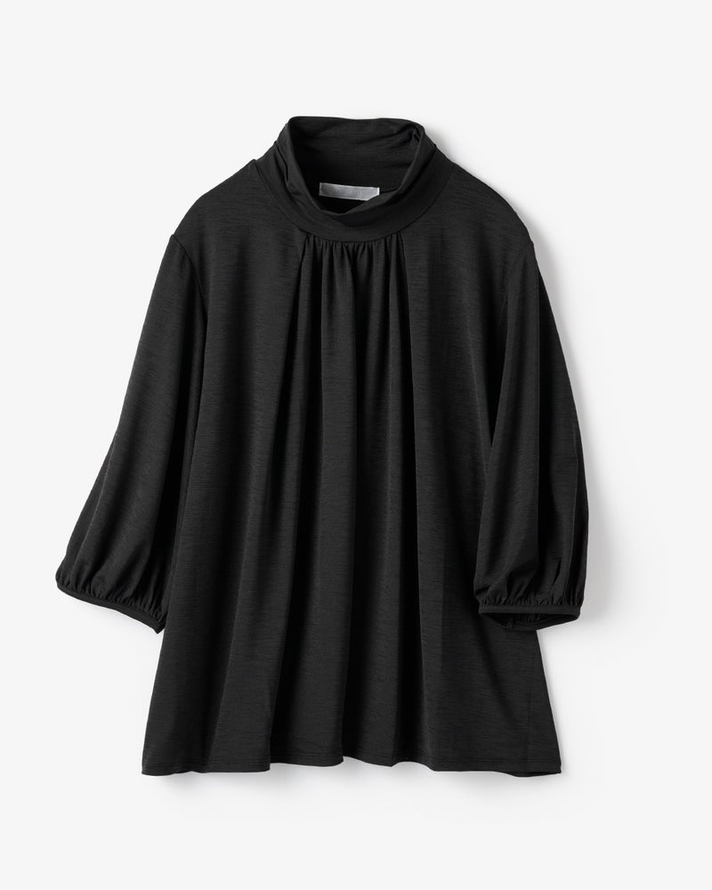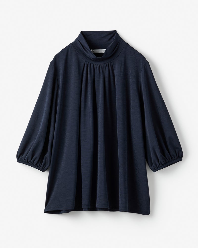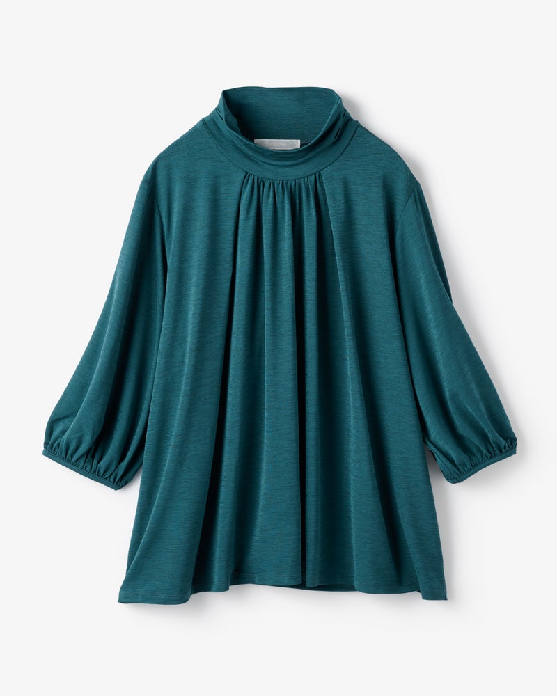 紫外線を90%以上カットする機能派カットソー、UVスラブのプルオーバーブラウス。首もとの日焼けを防ぎながら、顔印象も映えるギャザーハイネック。ギャザーから流れるふんわりしたフレアシルエットが、ボディラインをカバーしながらエレガントに。