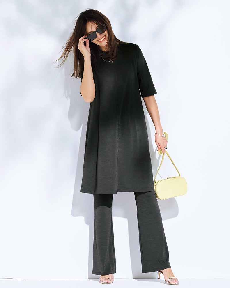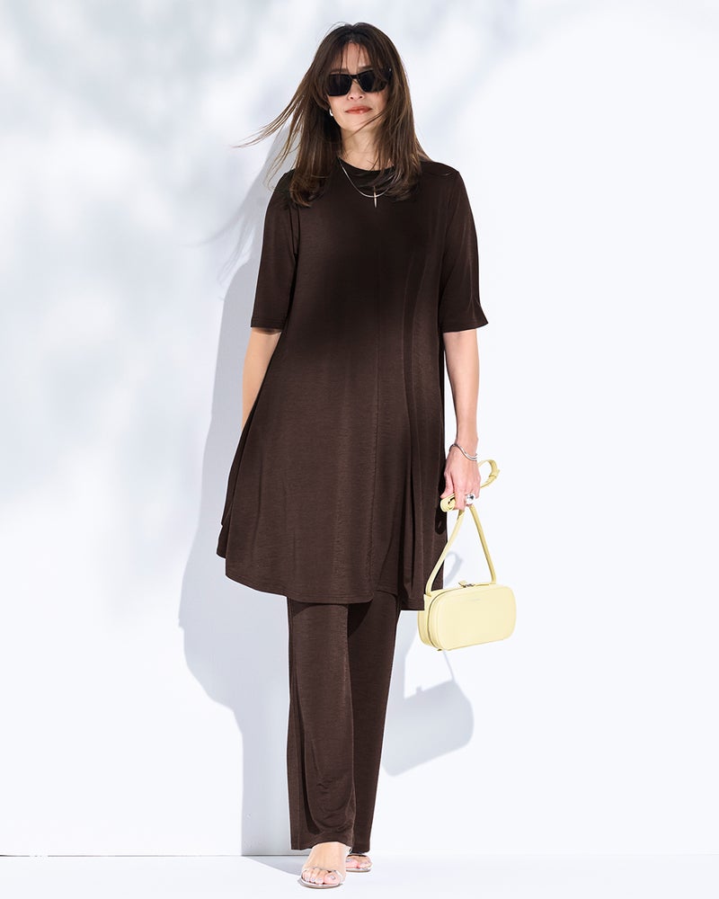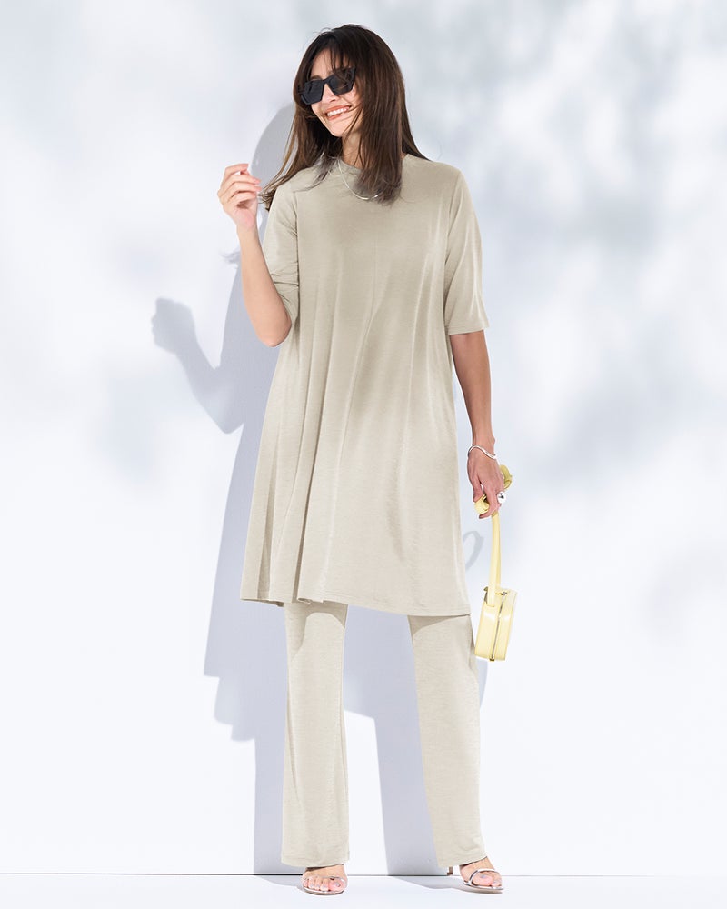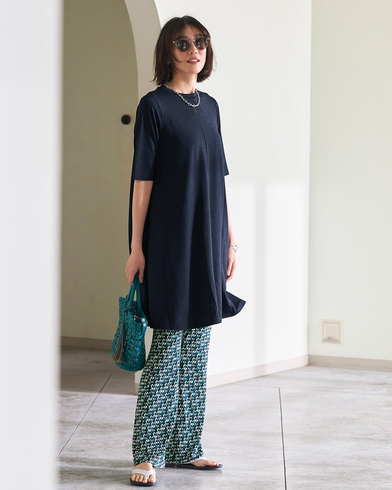 紫外線を90%以上カットする機能派カットソー、UVスラブのセミフレアパンツ。さらさらと肌にまとわりつかないドライな質感で、毎日はきたくなる美脚パンツに仕立てました。