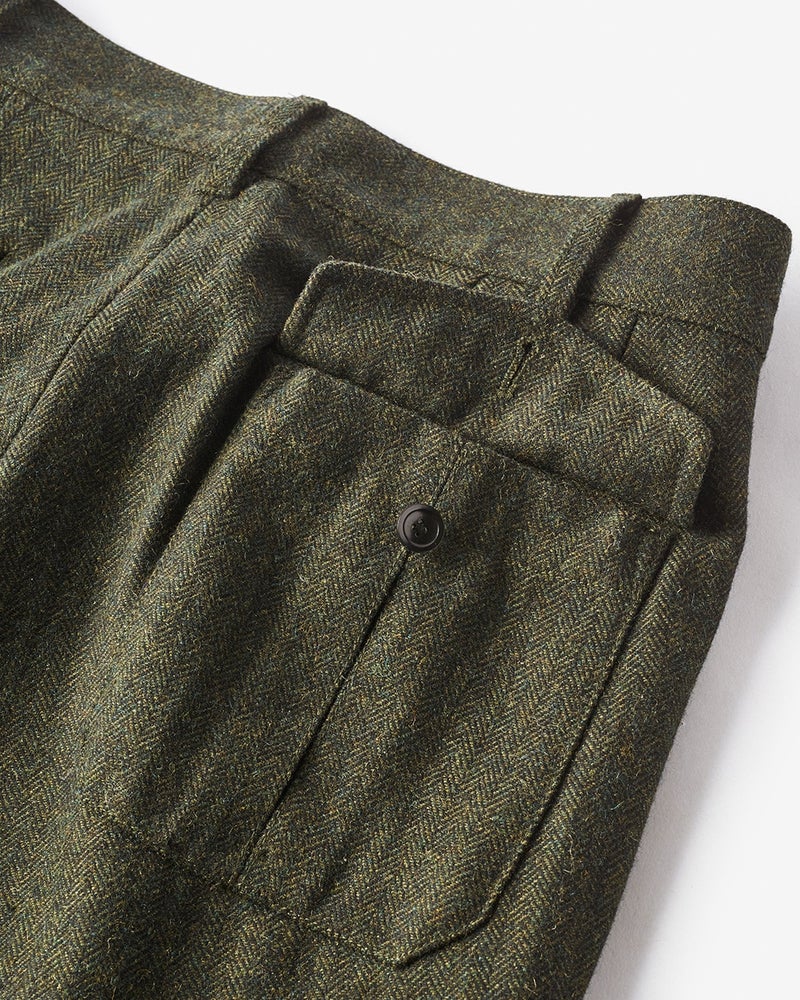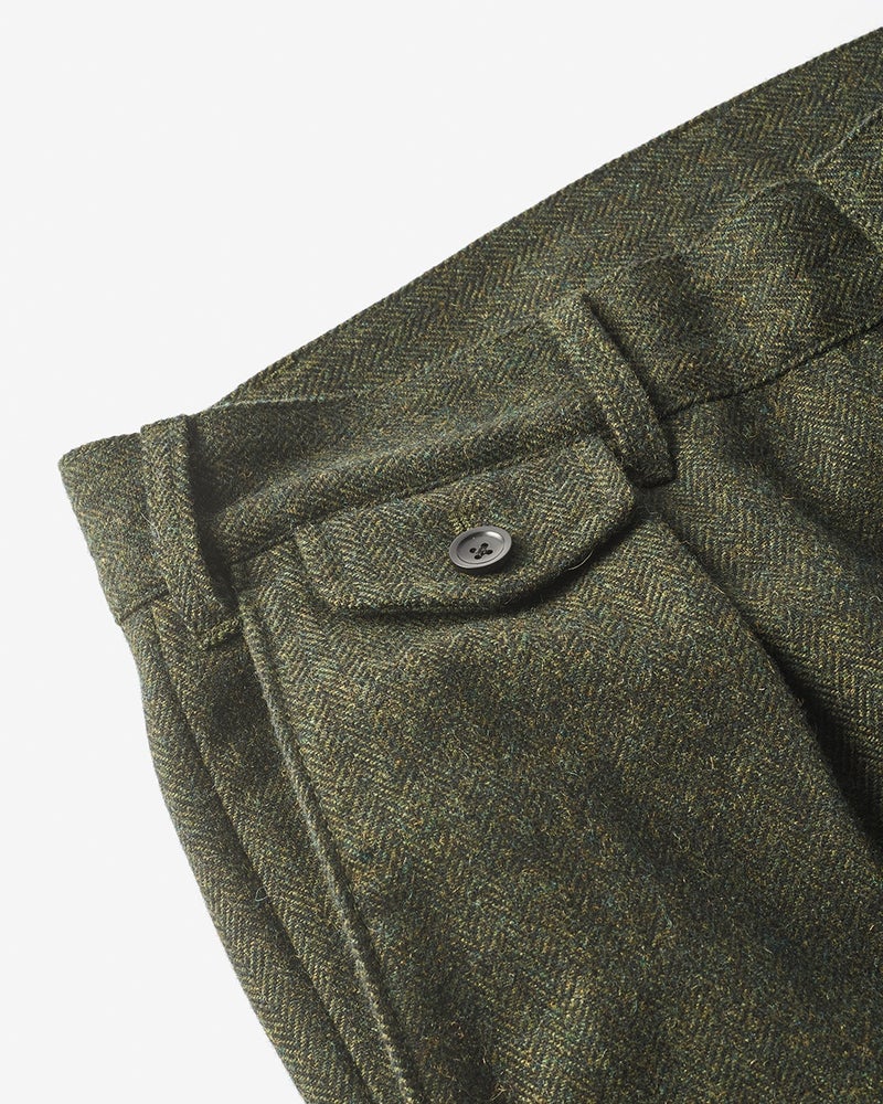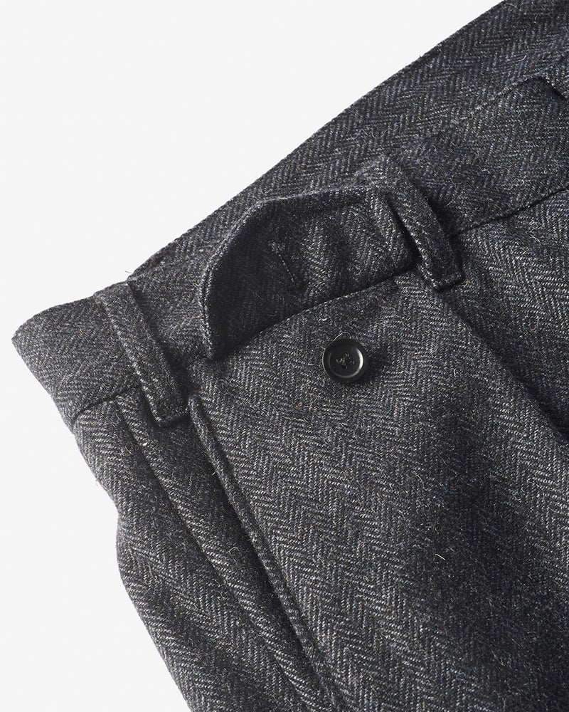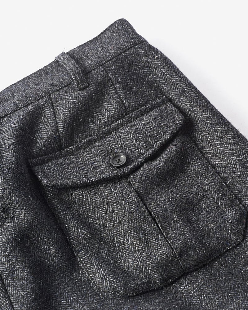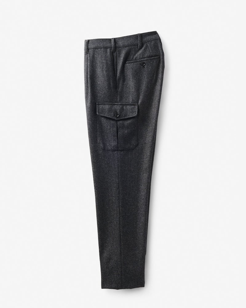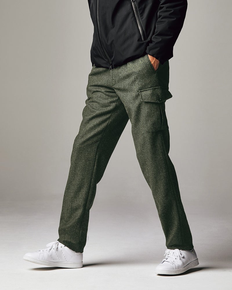ウール調の素材のカーゴパンツです。シルエットは裾に向かって細くなるテーパードタイプ。カーゴパンツの特徴であるカーゴポケットも左側だけに付け、全体をスマートな印象に見せるようにデザインしました。装いにカジュアルさと洗練された雰囲気をもたらします。