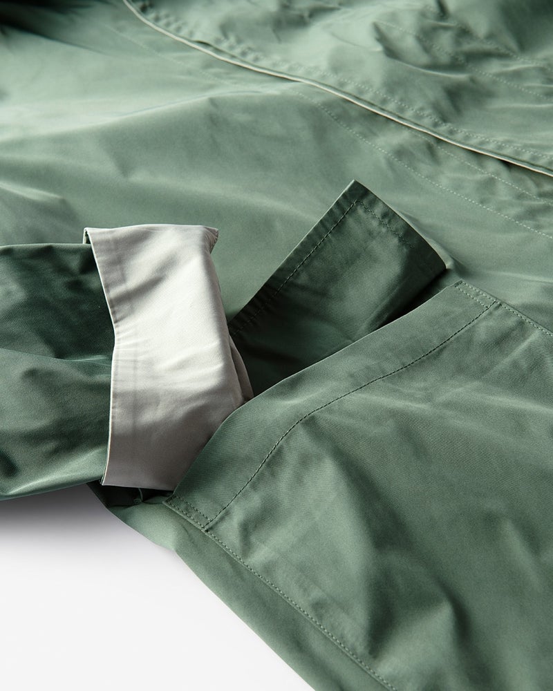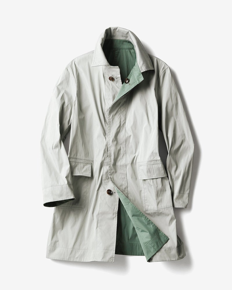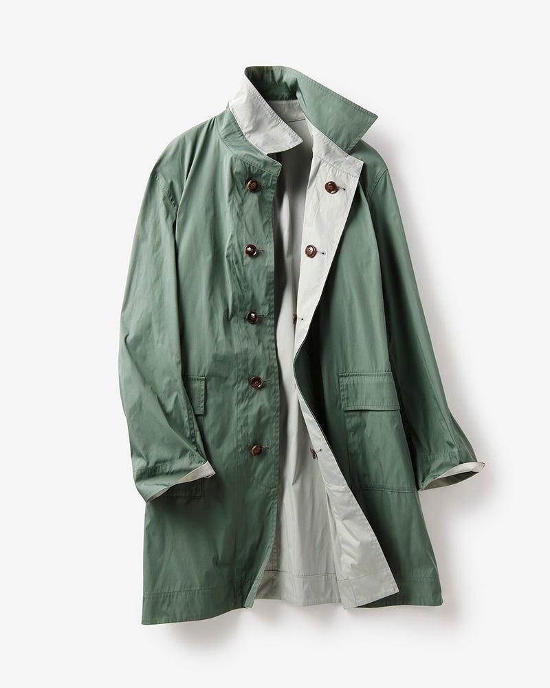 「二重織り」と呼ばれる素材を使ったステンカラーです。両面着用できるリバーシブル仕様ですが、型紙を工夫して、1枚で仕立てていますので、軽く、着心地も快適です。しかも素材は丸めてもすぐにシワが回復するメモリークロス。普段づかいはもちろんですが、旅先で着用する時に最適なコートです。