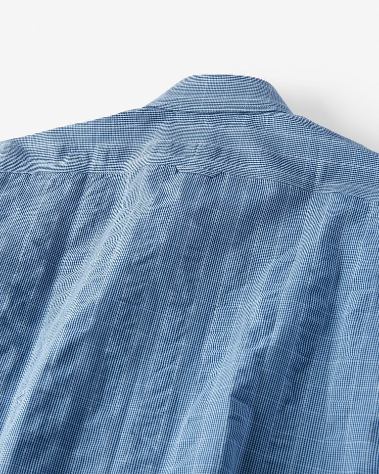 シャツの顔となる襟もとには、首に沿うようカーブさせた立体的な型紙を採用。きりりと美しい襟もとをつくります。チェックやストライプの柄をサイドやポケットできれいに合わせるなど、細部まで柄合わせしているので端正な印象に。