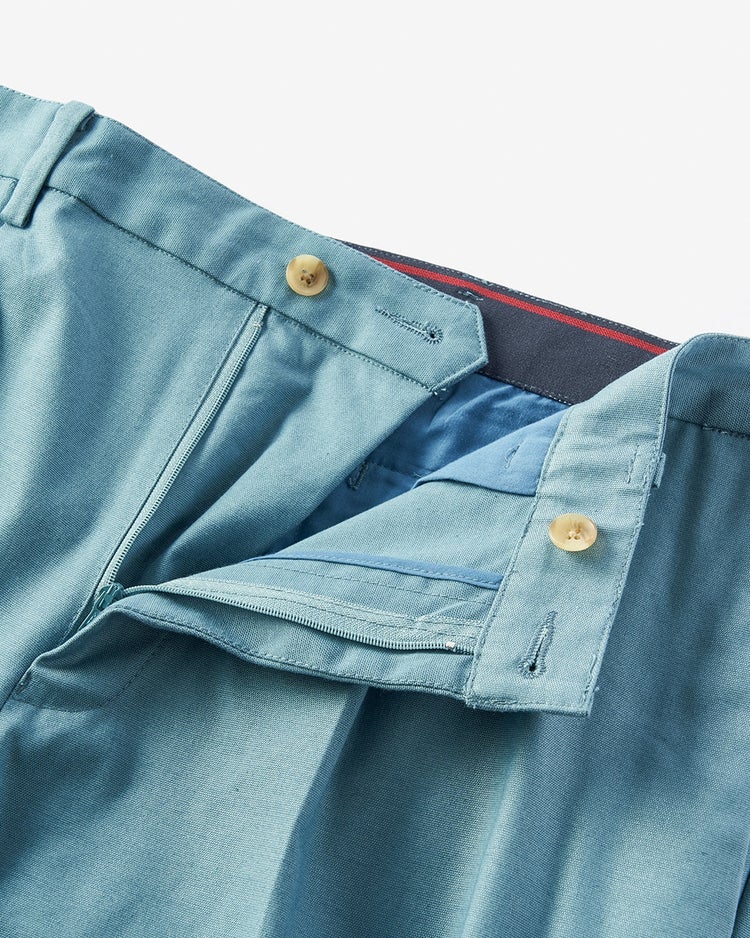 上品なオックスフォード生地で、ヨコ糸にはキックバックを高めたストレッチ糸を使用し、グッと伸びてしっかり戻り、シワになりにくく型くずれしにくく丈夫。後ろ隠しゴム仕様で快適です。