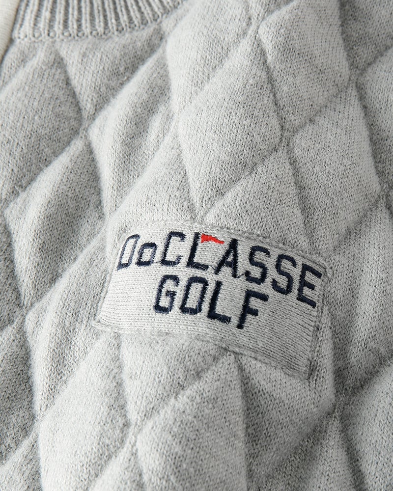 とことん動きやすく暖かなゴルフ用ニットづくりに挑戦しました。その切り札となったのが"糸綿"。身頃は、表と裏を同時に袋編みしながら"糸状の綿"を入れて、ダウンや中綿よりも高い伸縮性を確保。保温力もしっかり。袖口はスイングしやすいローゲージのリブ。前立てとポケット口の配色パイピングやロゴ刺繍も洒落ています。