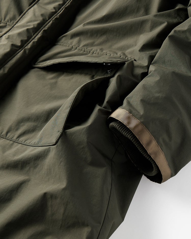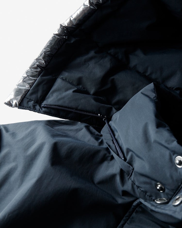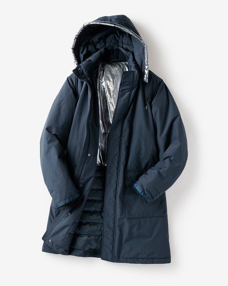 中綿に高品質なダウンを採用。さらに、後身頃の上半身部分はアルミプリントの裏地を配し、暖かさを極めました。前立てはジッパーとスナップボタンのダブル装備で防風、袖口もリブ付きで風の侵入を防ぎます。ボタン付きフラップポケットなど、ミリタリー風でありながら、ビジネスでも着こなせる端整な仕上がりです。ジャケットの上に羽織ってちょうどいいシルエット。取り外しOKのフードにはアルミの煌めきがキラリ。