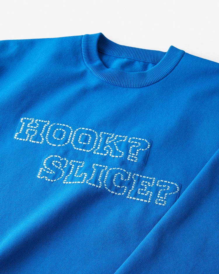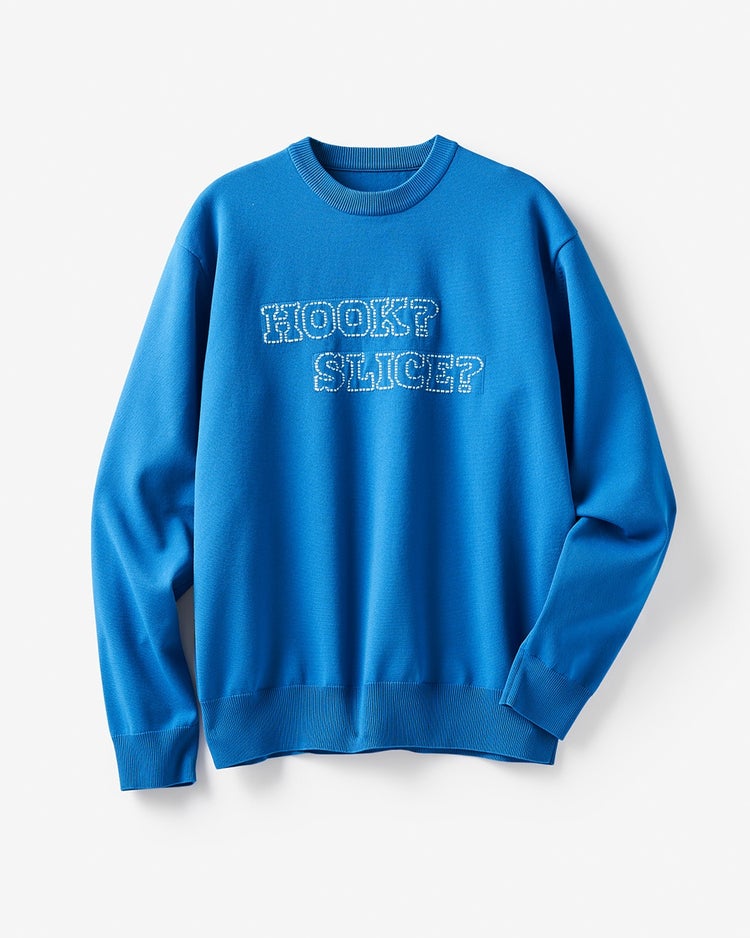 “HOOK?SLICE?”のメッセージロゴが、ゴルファーの遊び心をくすぐるニット。軽くて伸縮性に優れた生地で、ゴルフのスイングも軽快。袖口と裾はスイングを妨げないすっきり仕上げ。後ろネック下のブランドロゴ刺繍も洒落ています。