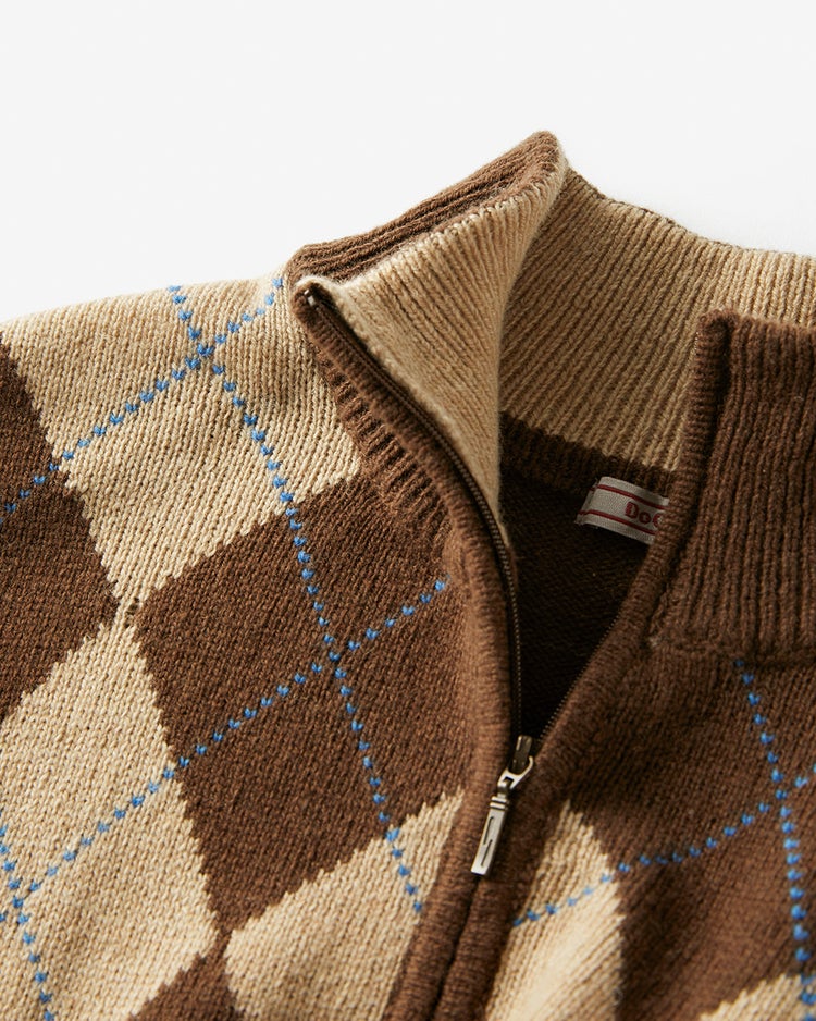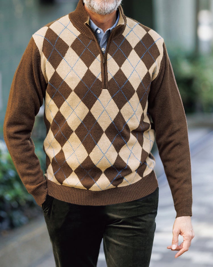 インナーのチラ見せが楽しいハーフジップ。シャツを中に着てもクルーネックと合わせても好印象です。ジップの開閉で、気温の変化に対応でき、着こなしも変わります。英国発祥の柄を若々しくアレンジしたアーガイル柄は配色の襟裏。