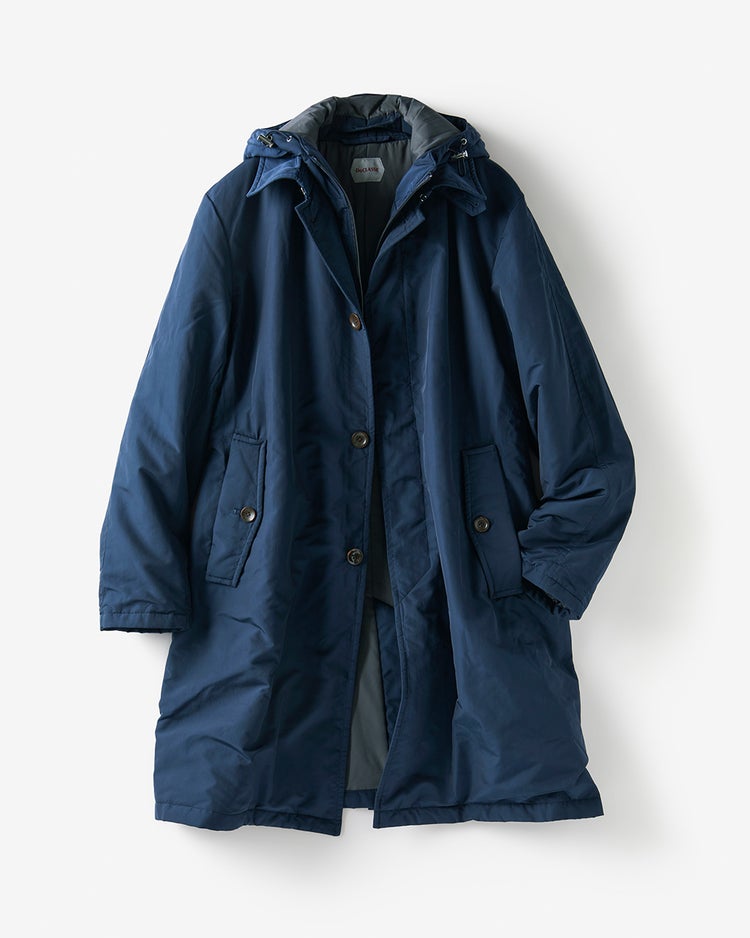 冷たい風をシャットアウト。台襟付きのステンカラーで、衿先のホックを留めれば防風仕様に。風が冷たいこれからの季節にも活躍間違いなし!