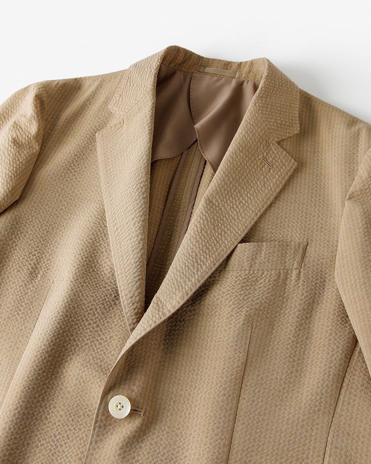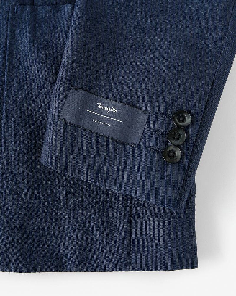 ビジネスにも着られるエレガントな夏ジャケットを、上質なイタリア生地で仕立てました。マルゾット社は180年を越える歴史をもつイタリア生地の老舗。多彩なコレクションから選んだナチュラルストレッチ生地は、ほんのりヘアライン調の織り柄とヴィンテージ風の色出しが大人の風格を醸しています。薄手の毛芯を使うクラシックなテーラード仕立てで、ジャケットスタイルに品格が備わります。