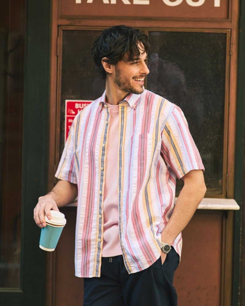 軽量でソフトなライトコットン100%のシアサッカーシャツ。生地の表面に浮かぶ波のような凹凸が特徴。凹凸のある織りが肌に触れる面積を減らすので、肌離れがよく、汗ばむ季節も涼しくて爽快な着心地。さらに、凸凹しているので、シワが目立ちません。