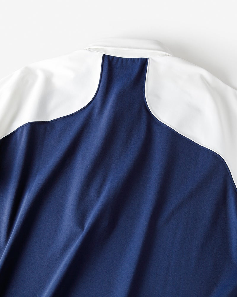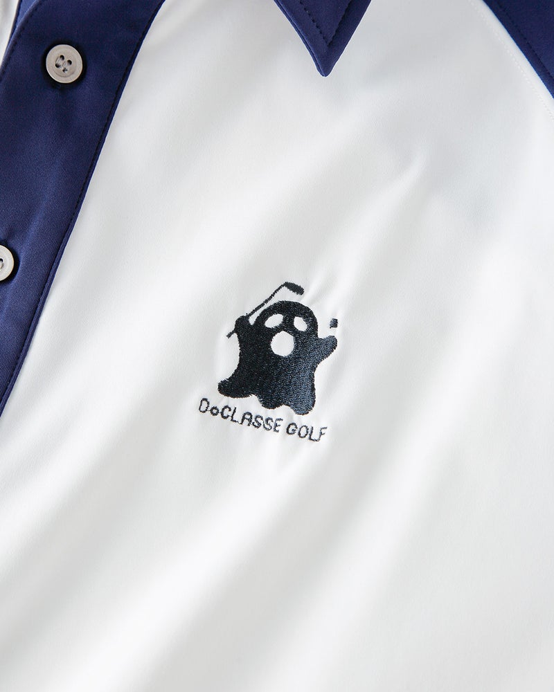 360度ストレッチするドゥクラッセオリジナル素材のゴルフポロに、初めてバケラッセの刺繍ロゴが付きました。ボタンを開けたときのプラケットテープもアクセント。素材には接触冷感性に加え、吸汗速乾、UVカット機能も付加しました。肩に縫製部のない独自のラグラン設計は肩回転がしやすくスイングも余裕です。