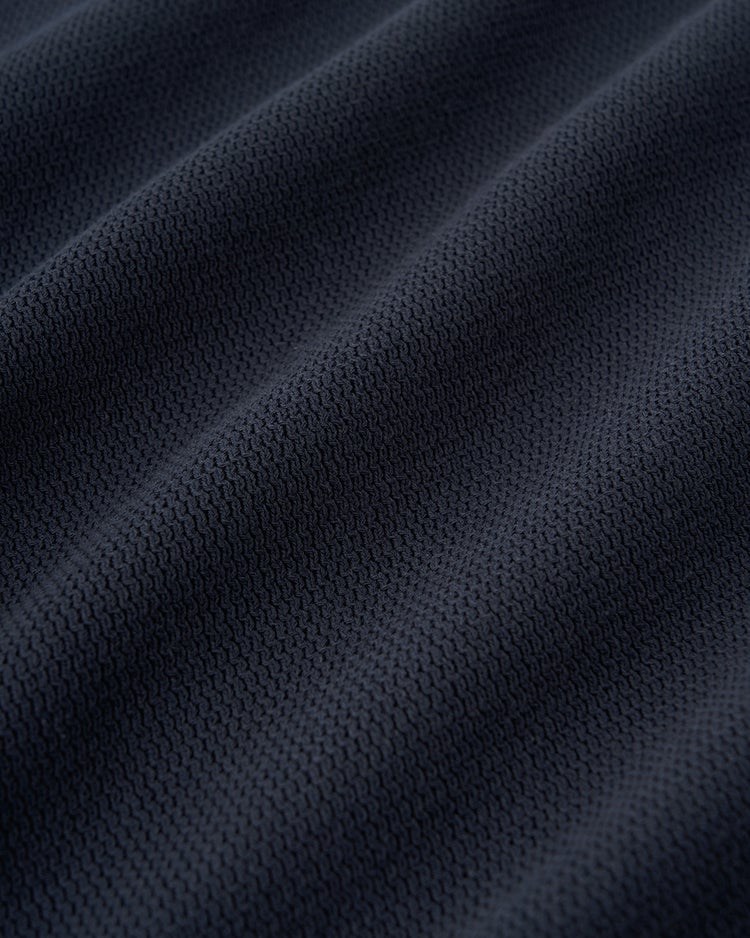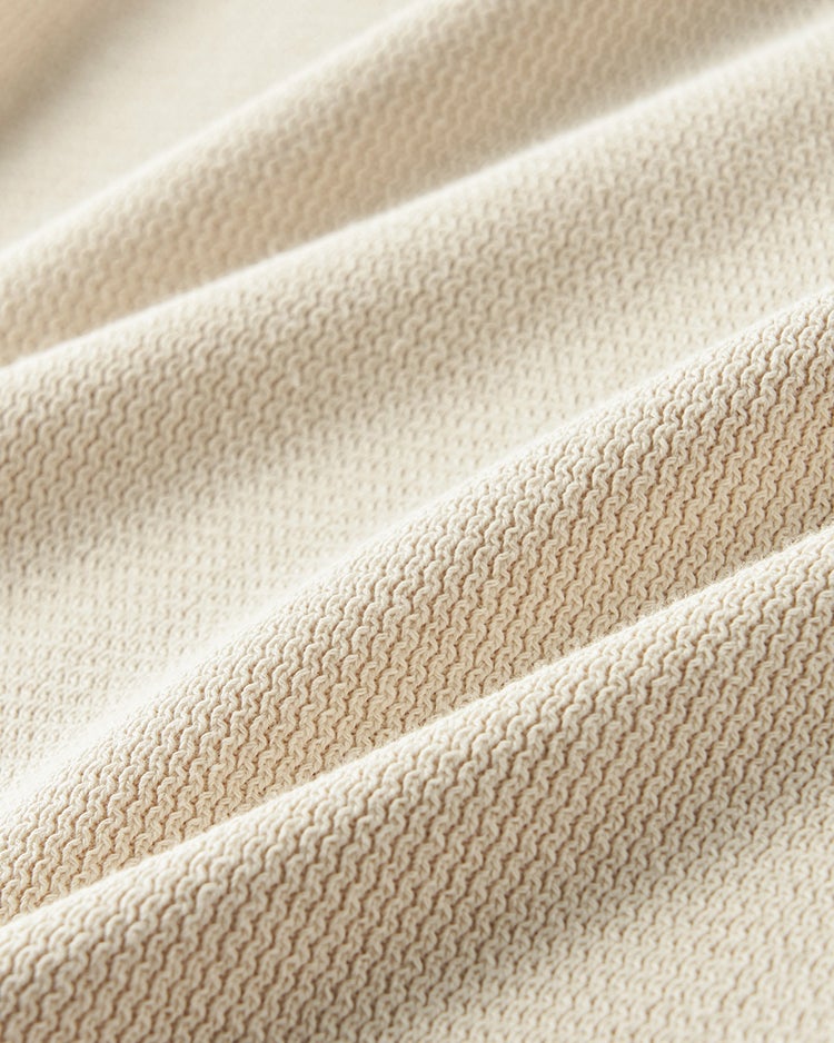 夏場、Tシャツ一枚では心許ないという方にはニットTがおすすめです。ニットの厚みとややゆとりあるシルエットはお腹周りを目立たせず、袖口と首周りはリブニットでしっかりフィットするので一枚で着ても品のあるスタイルに。表はニット、裏はカットソーというダブルフェイス素材が、初夏の素肌に心地よく馴染みます。