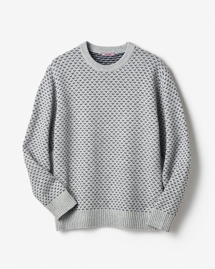 どこか懐かしくて新しい、スキーセーター感覚のスノーフレーク柄。安心感のある着心地と落ち着いた存在感がキラリと光る、「知的に攻める」1枚です。