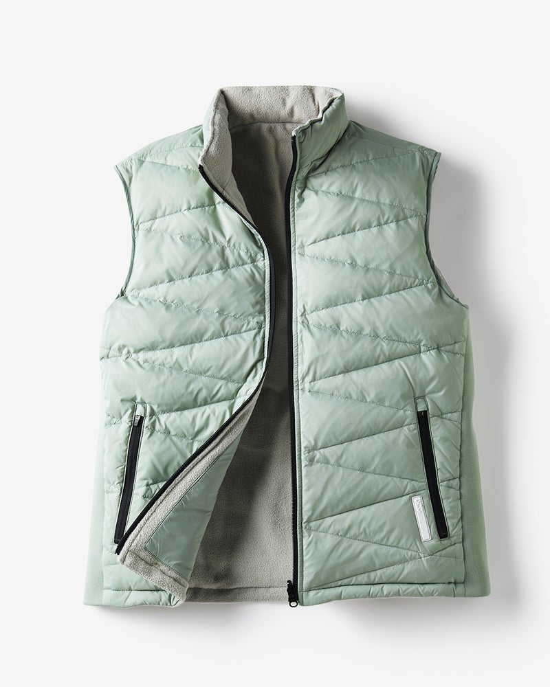 フリース面とダイヤキルト面のリバーシブルダウンベスト。中綿に上質なダウンをたっぷり使って保温性を高めながら、ボリュームを抑えることでインナー使いもしやすくなっています。フリース面は3ポケット、ダイヤキルト面はジップポケット仕様。リブニットの細腹で、ゴルフもアウトドアもアクティブに動けます。