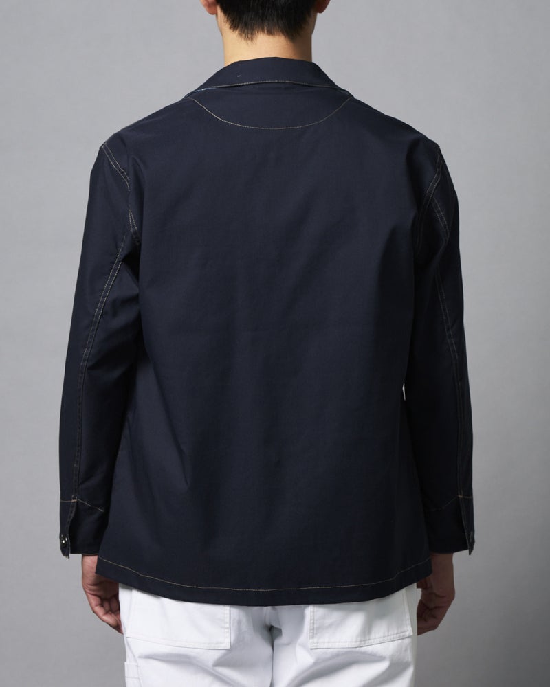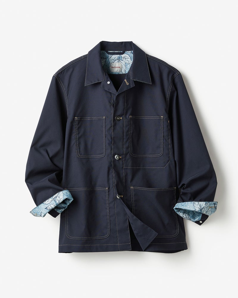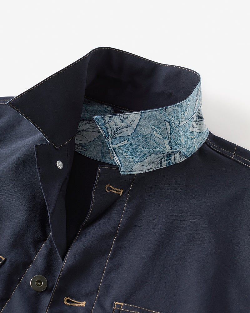 撥水性と横伸びストレッチを兼ね備えた新素材で作ったカバーオール。ワークウェアがルーツのアイテムを、いまどきの洗練デザインにアレンジ。配色ステッチを効かせ、衿裏・背当て布・袖口裏には花柄プリントの遊び心を添えて。アームホールなどの縫い目は折り伏せ縫いにして、丈夫さも追求しました。