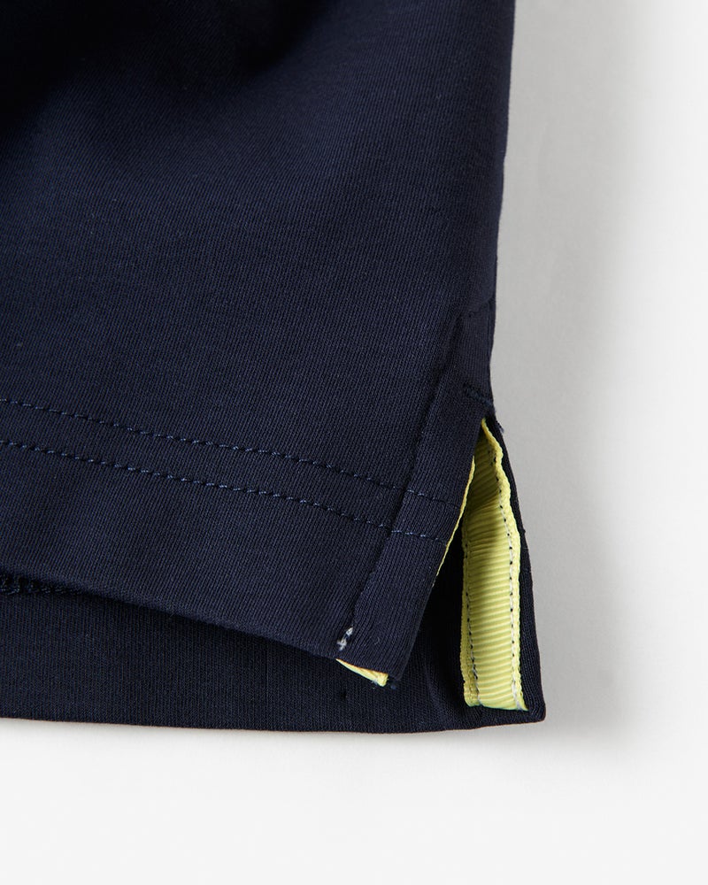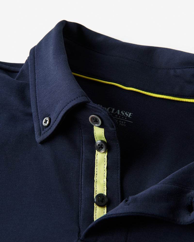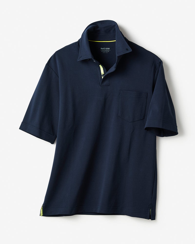 普段のサイズ:Mサイズ 着用サイズ:M - 今回はネイビー×ホワイトを選びました。前立てと脇スリット裏に入っているイエローのテープが良いアクセントになっています。衿がしっかりとしているのでジャケットのインナーにもピッタリ。アウターゴルフにも使えそうです。