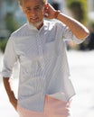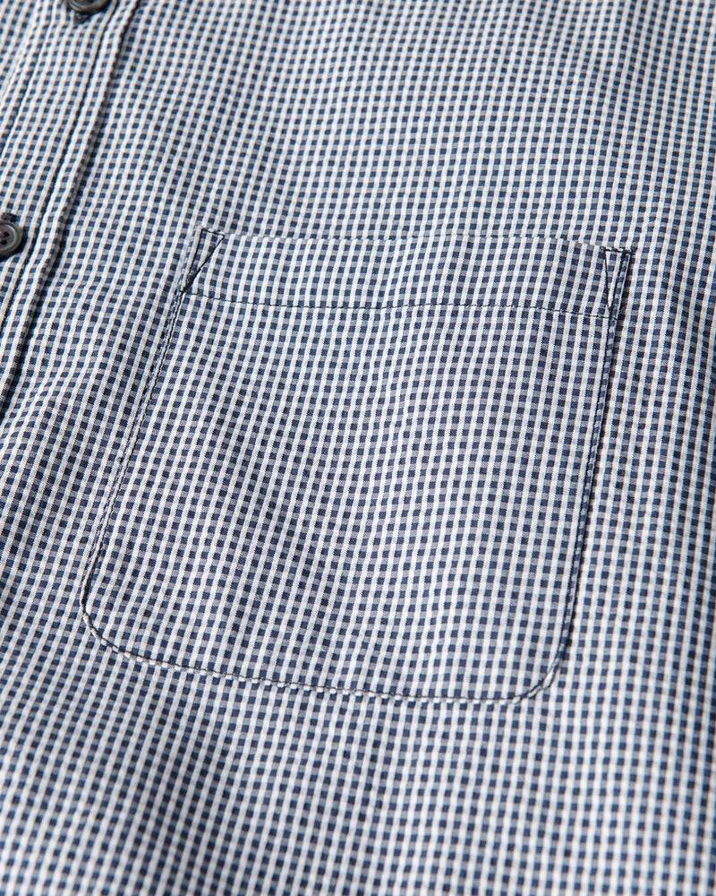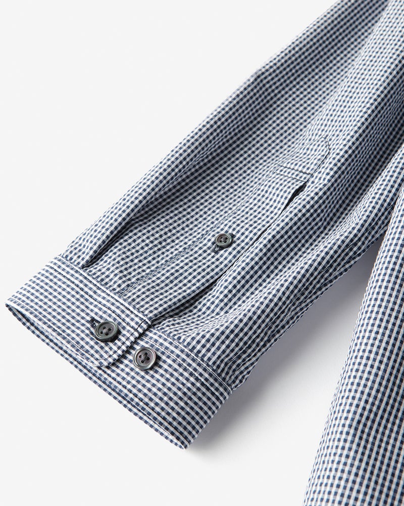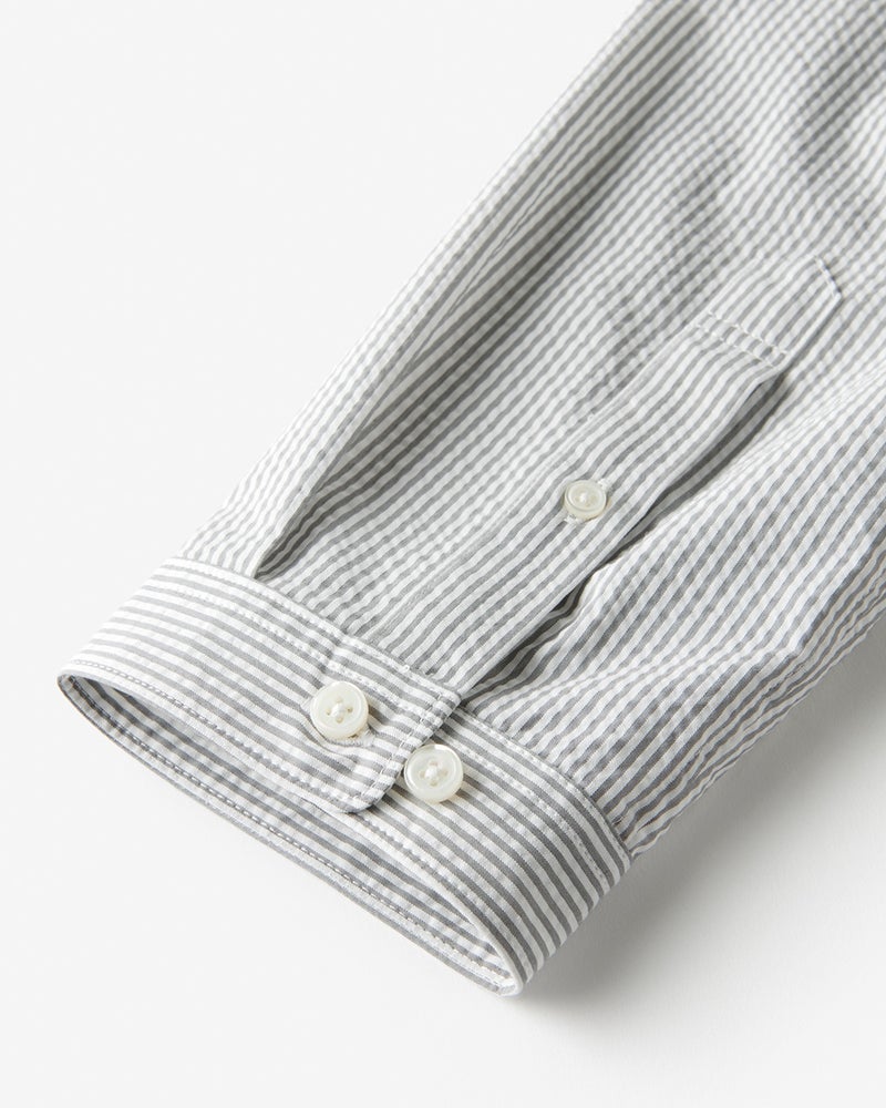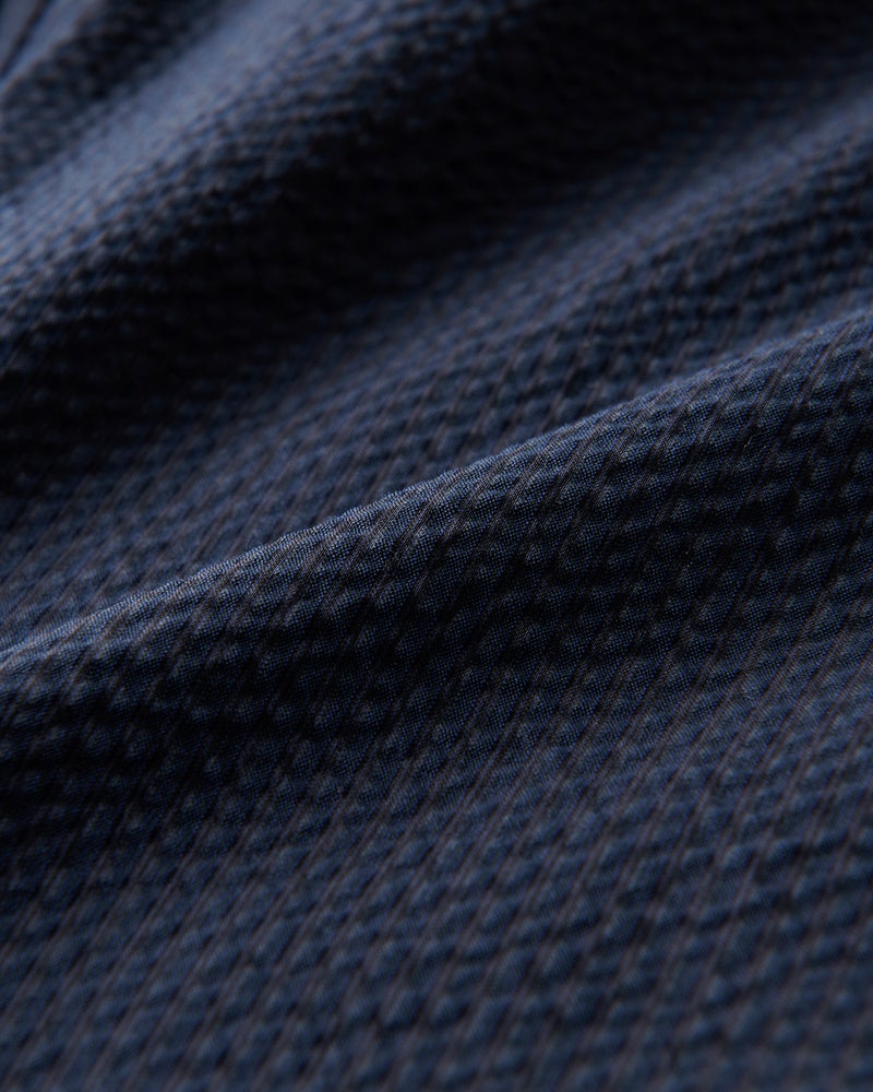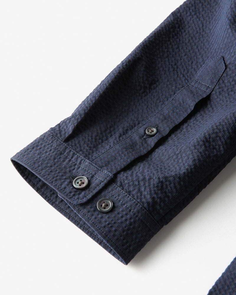 汗を吸ってすぐ乾くクールマックス素材を、凹凸感のあるシアサッカーに織り上げました。7分袖でスタンドカラーというのはDoCLASSE初のデザインで、軽快&知的な印象。首や背中にすっきり沿う設計。袖のカフスはすっきりと粋な細幅です。