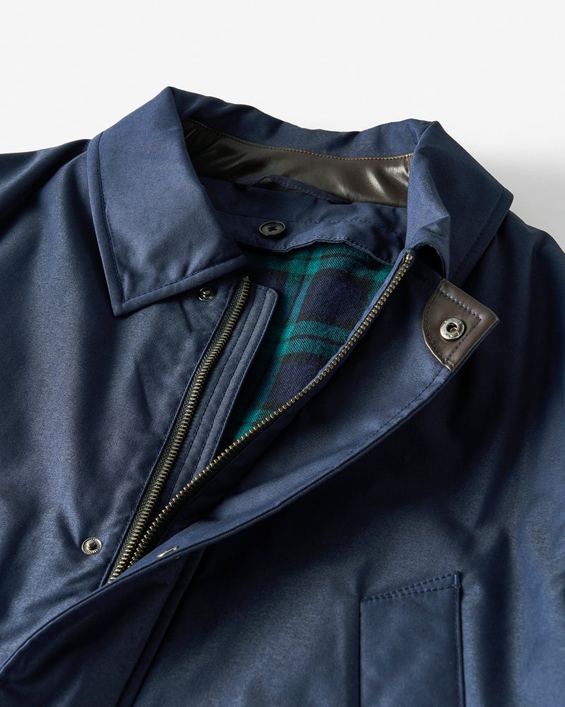 フロントはボタンとジッパーのダブル仕様で、閉じれば冷気や風の侵入を防ぎます。台衿、前立て裏の上端には、合皮をあしらいアクセントにしています。