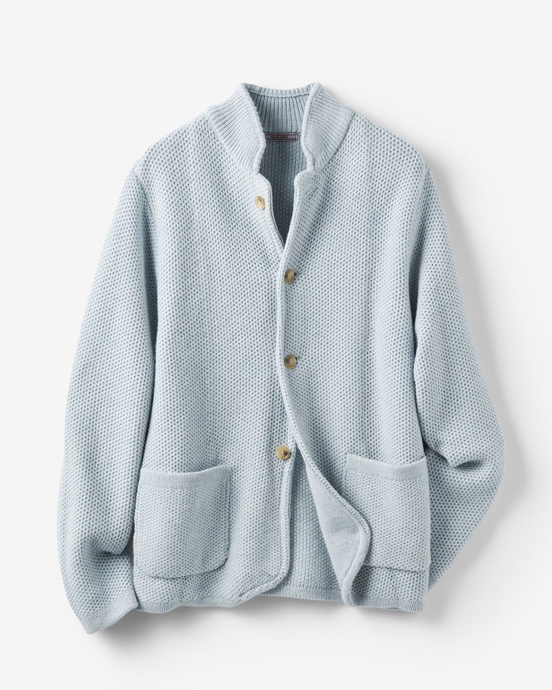 凹凸感のあるざっくりとした鹿の子編みの生地が、伸縮性を発揮し体をしっかりホールド。上質なラム素材を混紡した柔らかな風合いで、上品で奥深い男らしさを引き立てます。