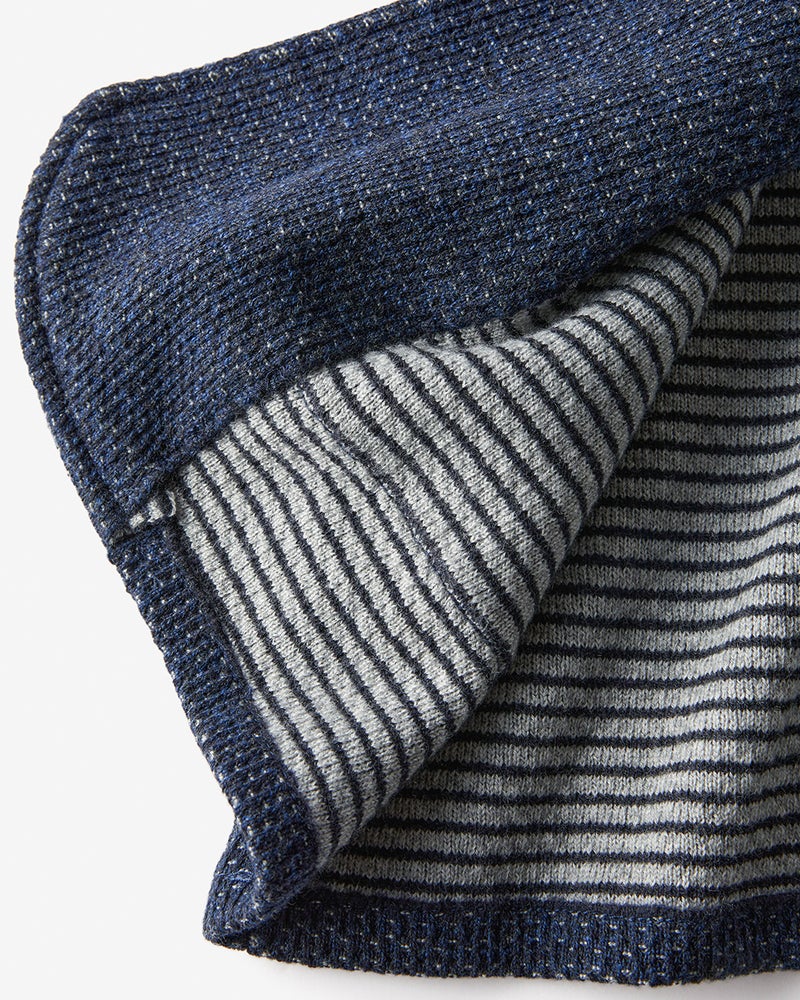 Point.2裏側はウール混の糸を使いボーダー柄に編み立てました。表地の色ごとにボーダーの色を変えるという、見えないところまでこだわりのあるデザインに。優しい肌触りで吸湿性にも優れています。