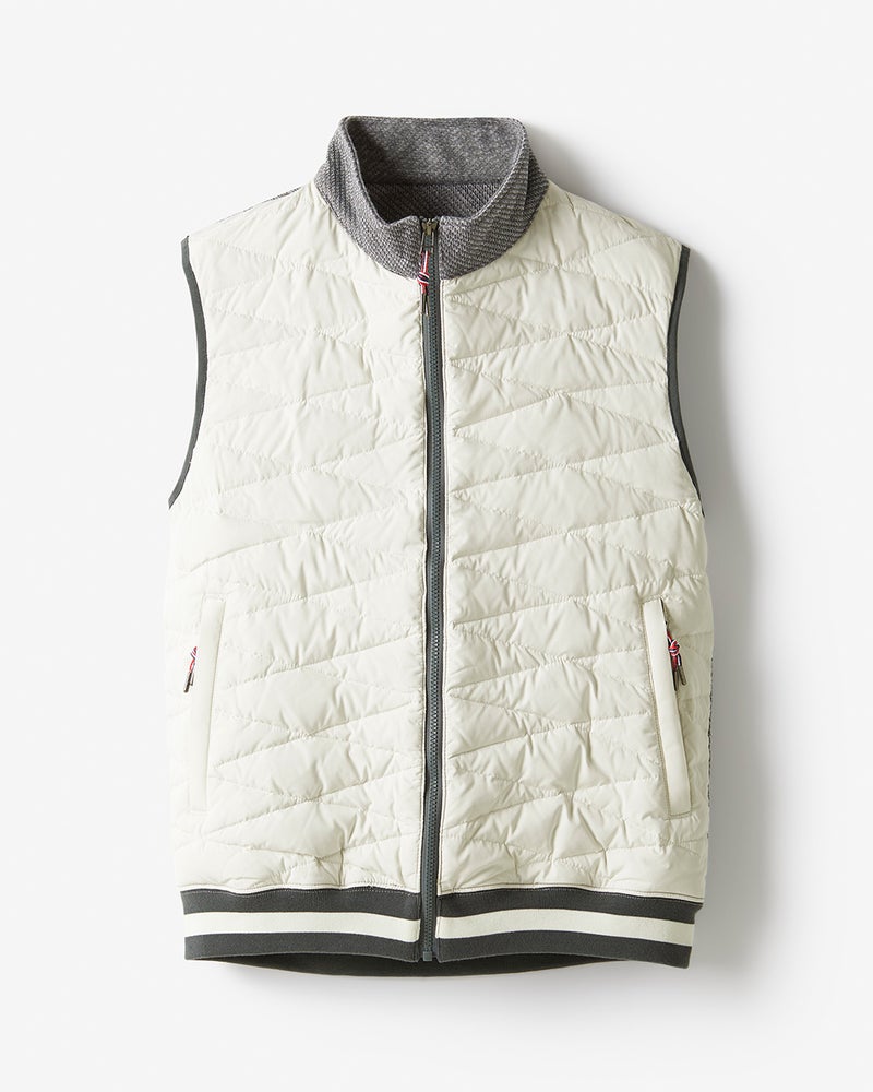 フロントはほどよい光沢のある生地に横長のダイヤ型ステッチを施し、中には、ダウン80%、フェザー20%という混率のダウンを詰めていて、しっかり暖かく、使い勝手抜群です。