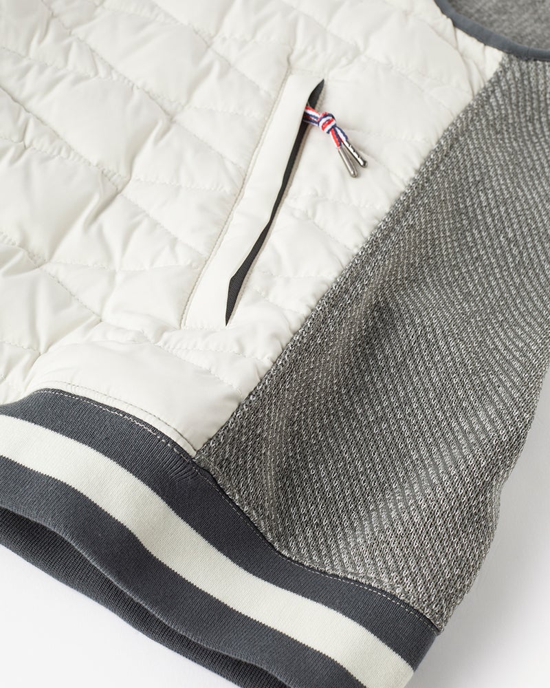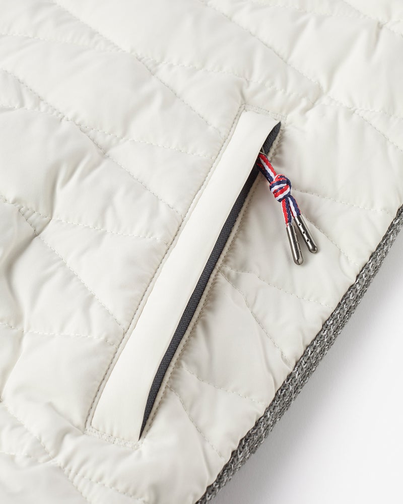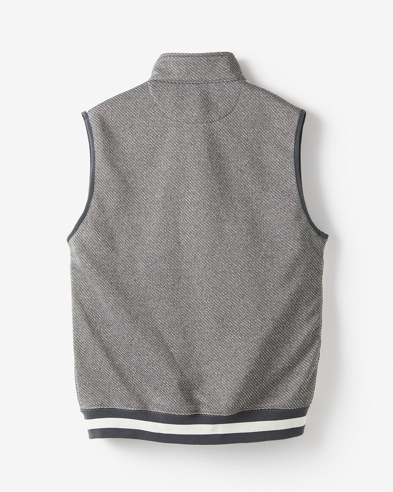 後ろ身頃は肌触りがよく、ストレッチ性のあるフリース。2色のカラーをミックスした上品な素材感です。アームホールには肌当たりのよいトリコットのパイピング仕様に。