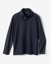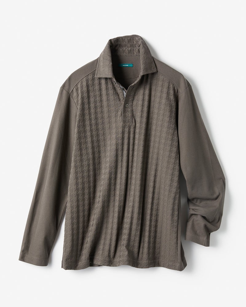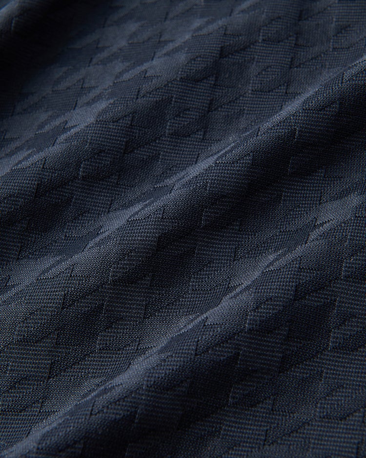 衿と台衿、前身頃は主張しすぎず陰影のある千鳥柄ジャガード。袖と後ろ身頃は無地のハニカム生地。そのコンビネーションが上品なお洒落を演出します。衿が立ち上がりきちんと見える台衿付き。肩線を前側に傾斜させた、腕を振りやすくゴルフのスイングがしやすい設計です。