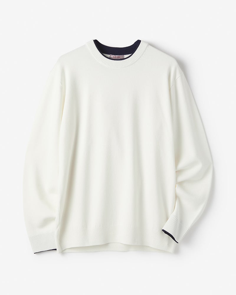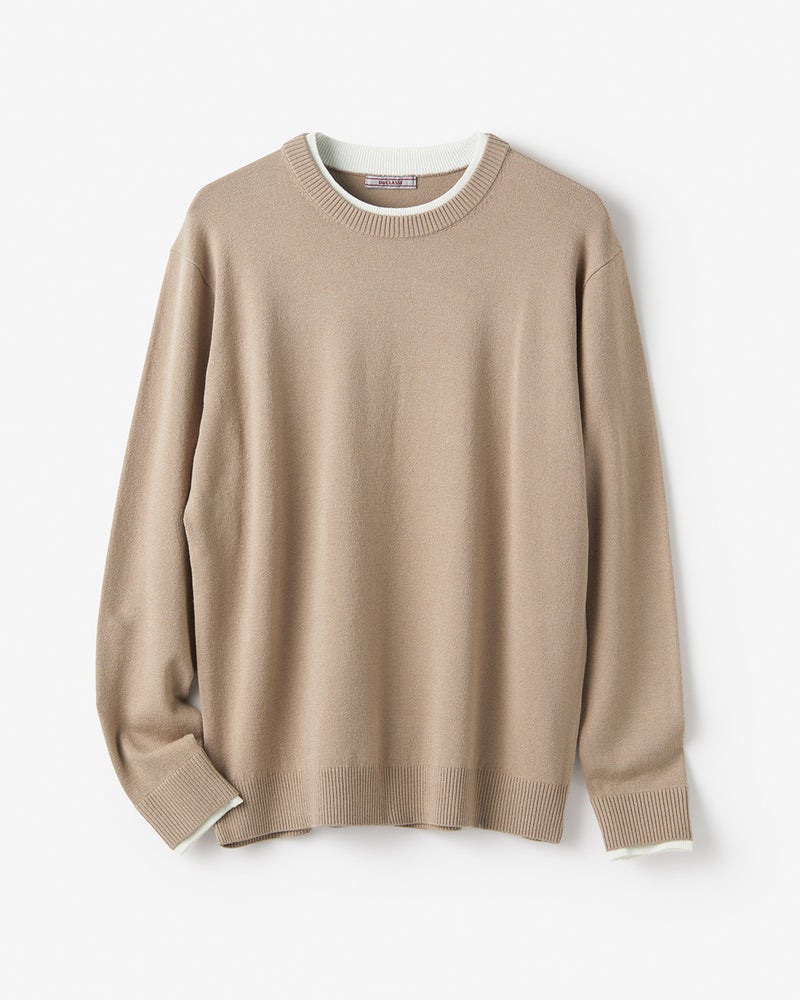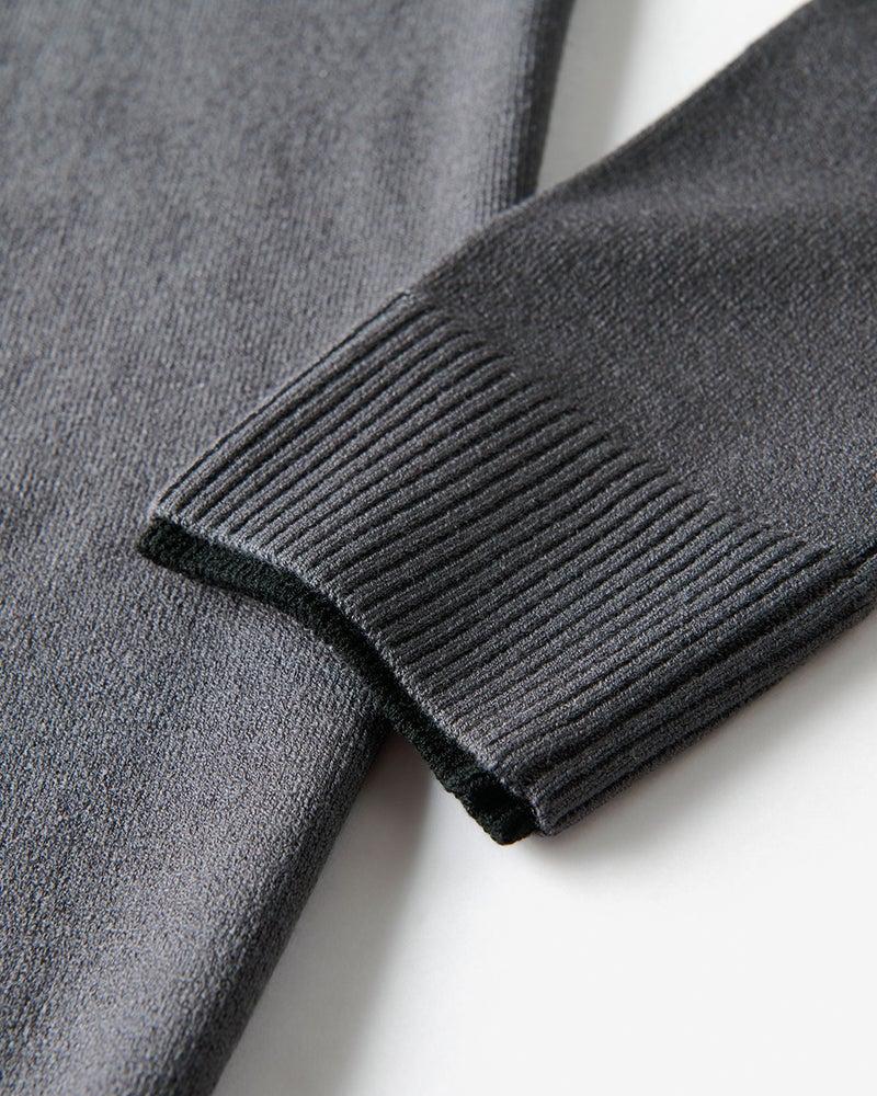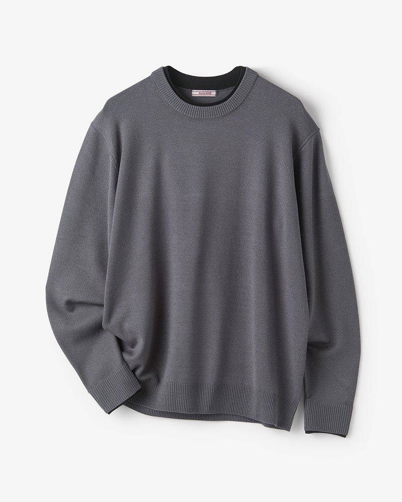 衿と袖口の内側に配色生地をあしらったフェイクレイヤードニット。1枚で重ね着しているようなデザインで、1枚でコーディネートが簡単に完成します。衿から見える配色生地のバランスが秀逸。素材は、毎年好評の「Doサーモテックス」。体が発する汗や水蒸気を吸収して発熱。薄くて軽いのに、しっかり暖めます。