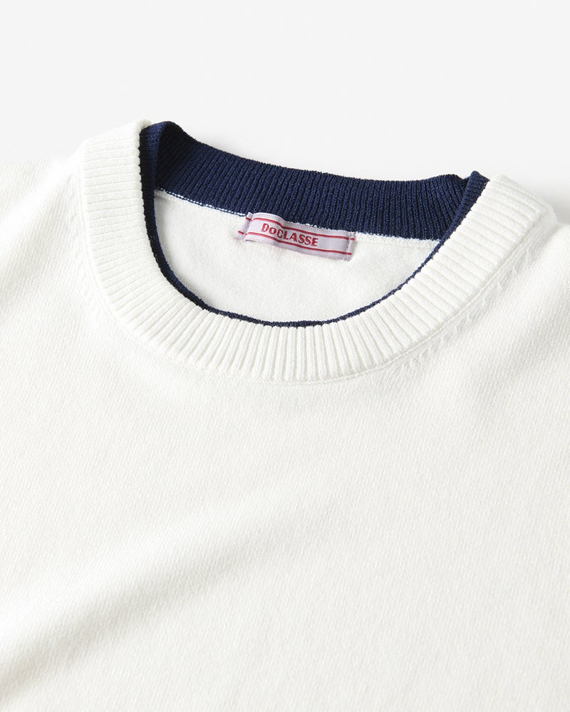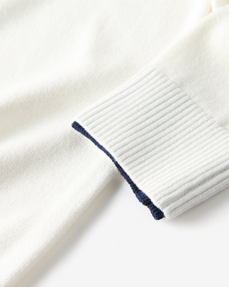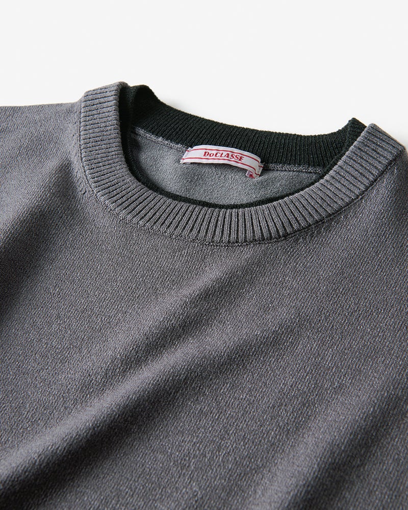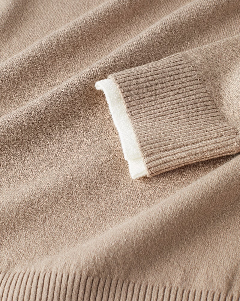 衿と袖口の内側に配色生地をあしらったフェイクレイヤードニット。1枚で重ね着しているようなデザインで、1枚でコーディネートが簡単に完成します。衿から見える配色生地のバランスが秀逸。素材は、毎年好評の「Doサーモテックス」。体が発する汗や水蒸気を吸収して発熱。薄くて軽いのに、しっかり暖めます。