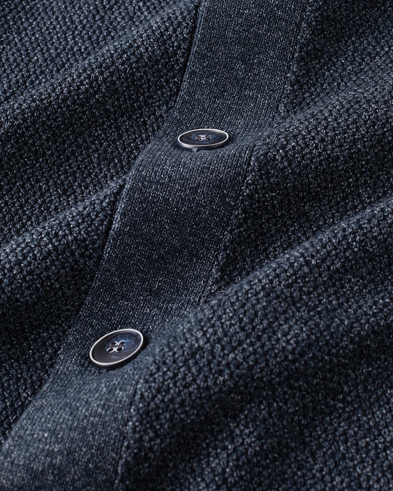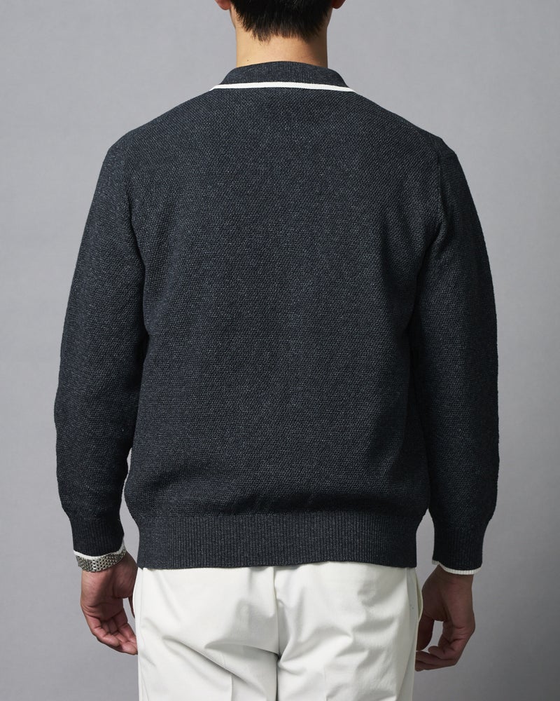 • 編み目が上品な12ゲージの鹿の子編み。インディゴのような見た目ながらも色落ちせず、シワにもなりにくいイージーケア仕様。