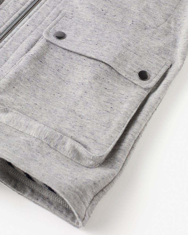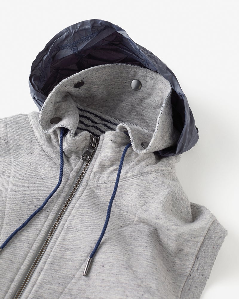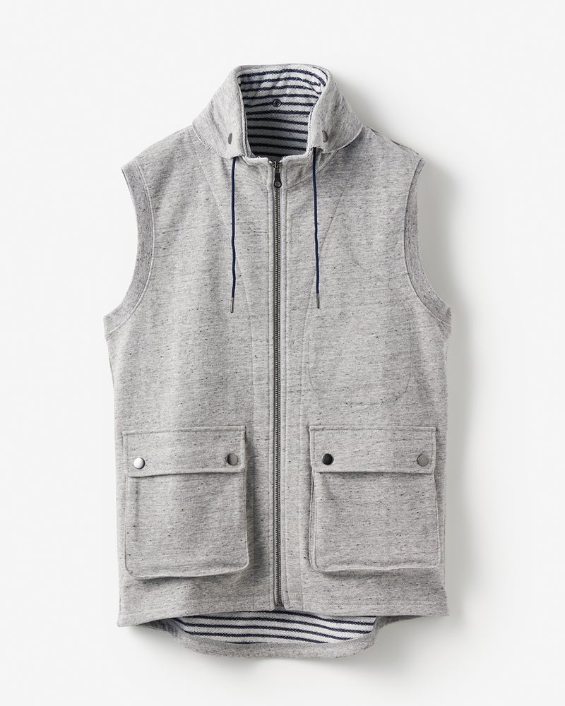 マリンテイストのスタンド衿の中からフードが出現するベスト。フードを出したりしまったりして、2WAYの着こなしを楽しめます。