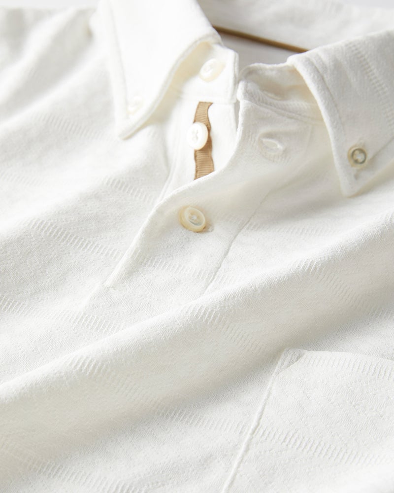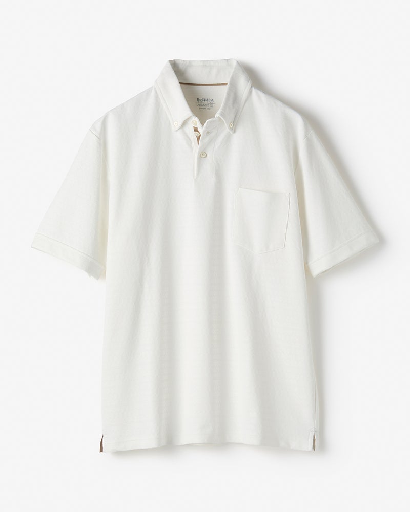 緻密なボーダー柄に編み立てた、きれいめ印象のジャガードポロ。編み地の柄の凹凸のおかげで肌離れがよく、サラッとした肌触り。伸縮性に優れ、吸汗速乾性も備えているので、ゴルフなどのスポーツシーンでも活躍します。ムレにくく、汗をかいてもすぐ乾きドライ。衿ぐりの内側、下前立てと裾両サイドスリット裏には配色のアクセントを効かせています。