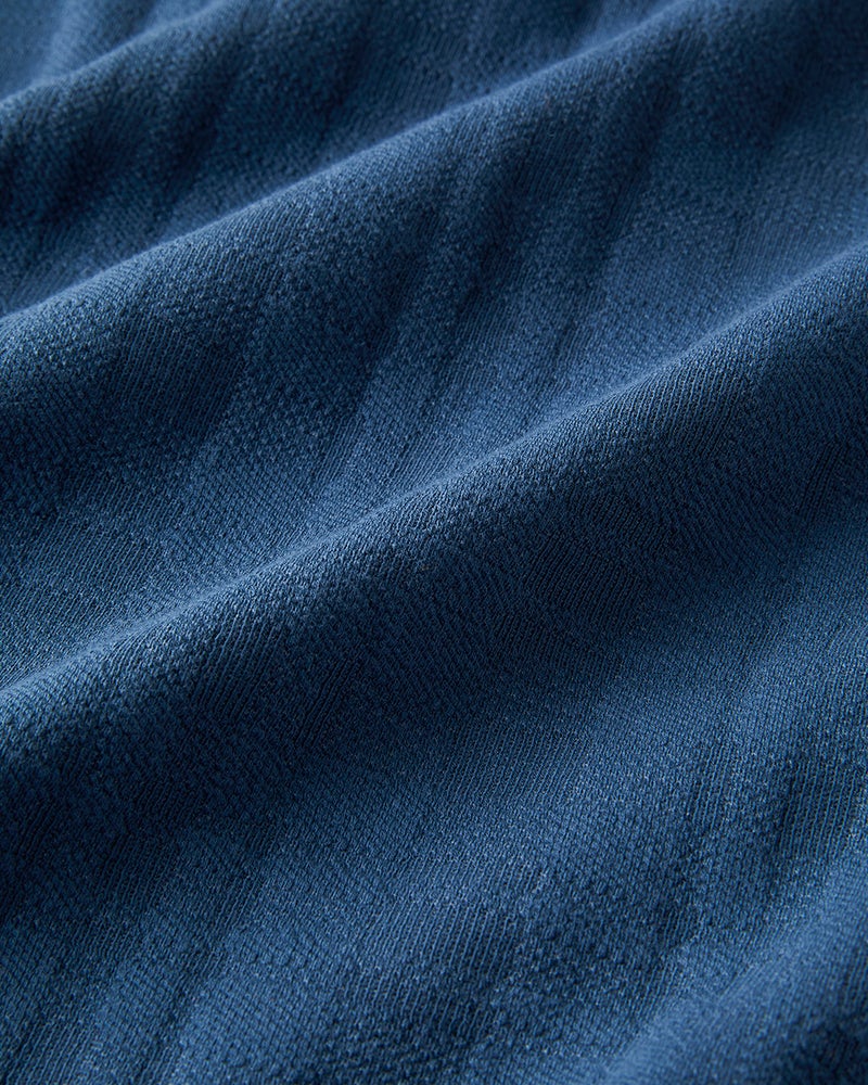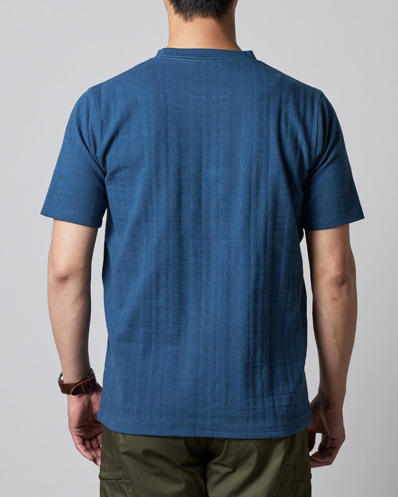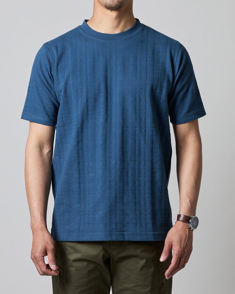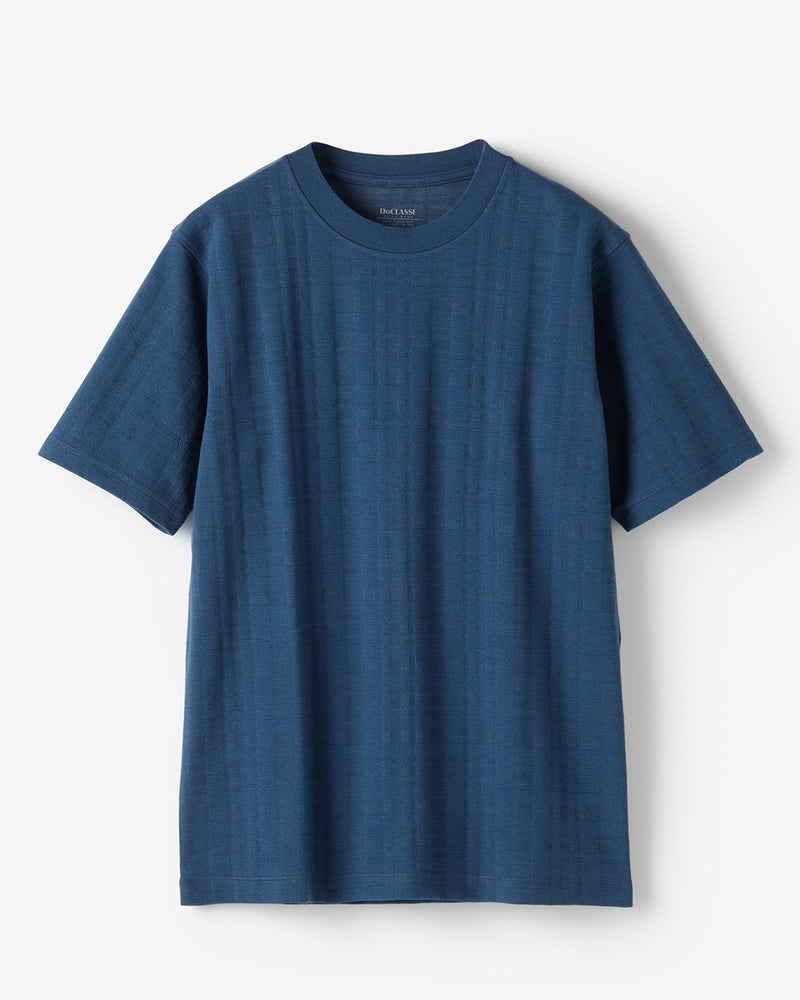 光の当たり具合によってチェック柄が浮かび上がる、綿混素材のTシャツ。ジャガード編み地の柄の凹凸のおかげで肌離れがよく、サラッとした肌触り。きれいめなので、1枚で着て洗練された印象、インナーとしても合わせやすく、夏の着こなしに重宝します。