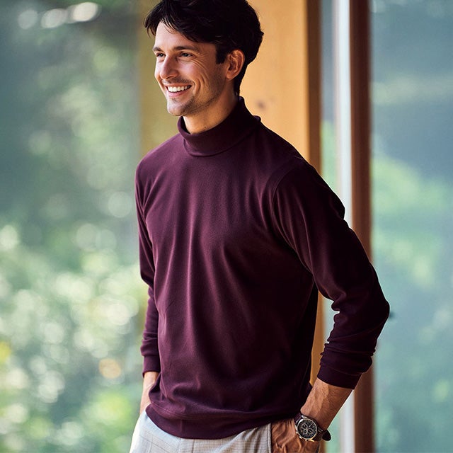 生地の両面に起毛をかけた、なめらかな肌触りのウルトラソフト生地。首元までとろける肌触りのタートルネックは毎年人気です。