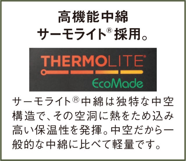 秋冬の守護神サーモライト®ダウンの保温性に勝るとも劣らない高機能中綿サーモライト®を採用。サーモライト®は中空構造で、それゆえにとても軽量で、体から発せられた熱を逃さずキープし、空気の層を作り出し保温します。中綿を身頃に入れる分量を何度も検証して、保温性は確保しつつ、着ぶくれしないシルエットを実現しました。