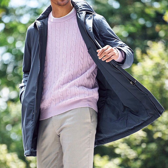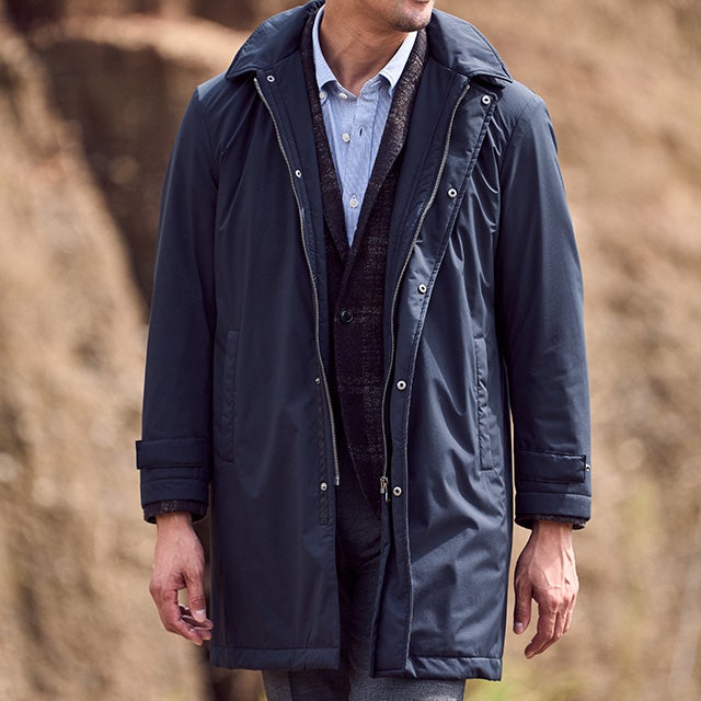品よくビジネスシーン映え上品なルックス、すっきり印象のステンカラー、ボタン留めの前開き比翼、袖口タブ付きというスーツの上にも違和感なく着られるデザイン。長すぎず短すぎずのほどよい着丈だから、仕事でも休日でも幅広く着こなせます。