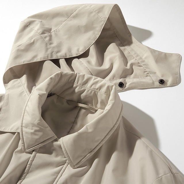 衿はステンカラーで、衿裏のドットボタンで脱着できるフード付き。