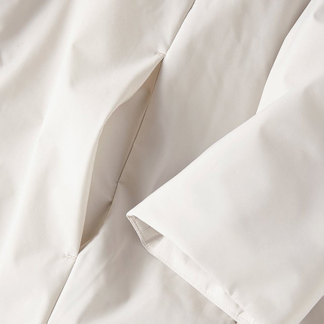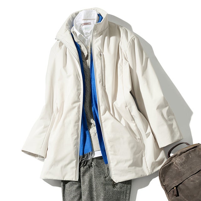 付属の収納袋にしまえて、持ち運びに便利な軽量パッカブルコート。衿はシンプルなスタンドカラーだから、オンもオフも品よく着こなせます。ボリュームを抑えた中綿の分量だから、着ぶくれせず、すっきりキマります。