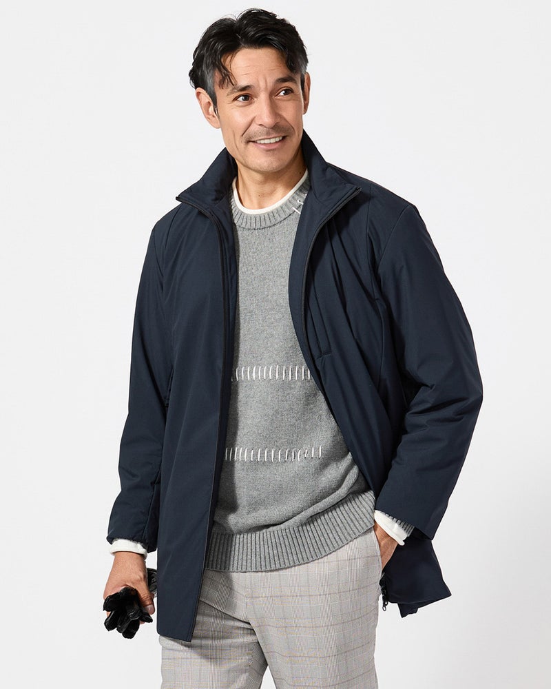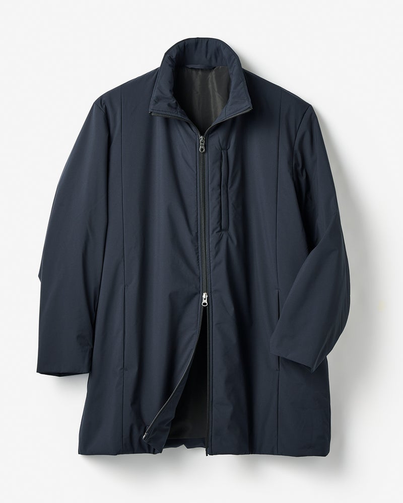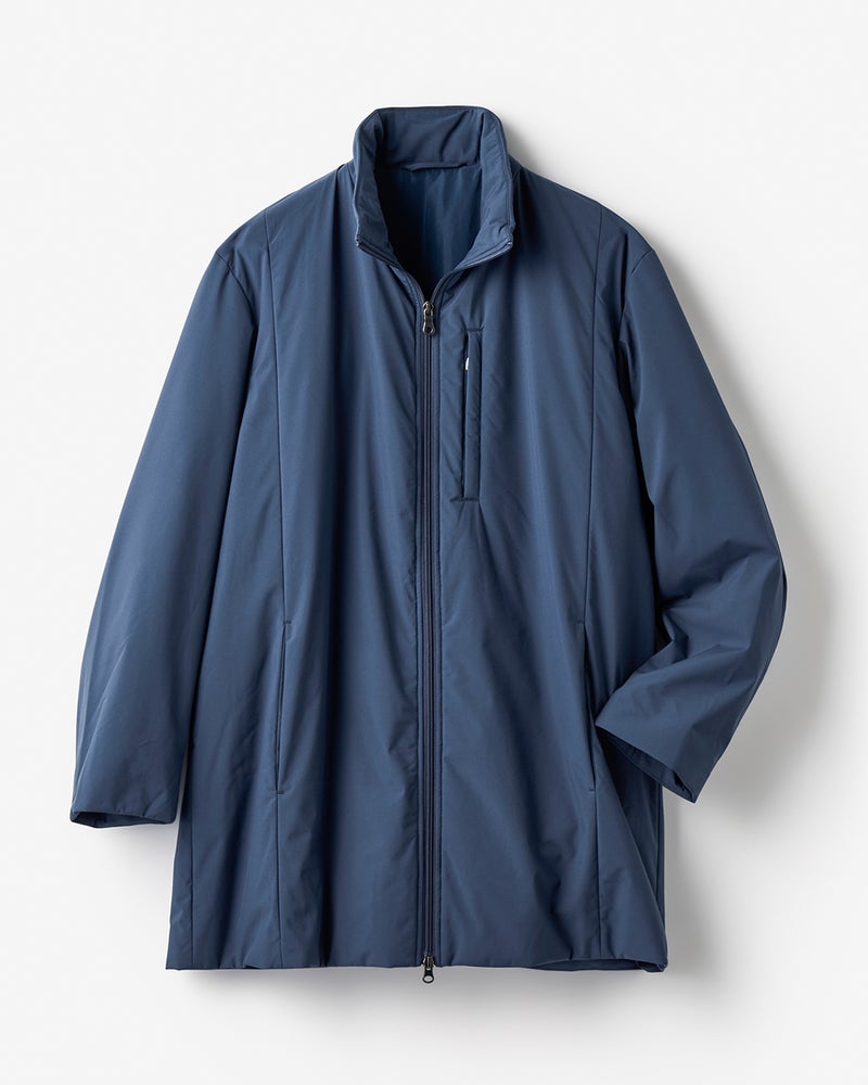 旅や出張では、小さく畳んで鞄にしまえるパッカブルコートがあると重宝します。この軽量パッカブルコートは、付属の収納袋にしまえて、持ち運びに便利です。衿はシンプルなスタンドカラーだから、オンもオフも品よく着こなせます。中綿には軽くて保温力のあるサーモライト®を使用。ボリュームを抑えた中綿の分量だから、着ぶくれせず、すっきりキマります。ジャケットや厚手のニットの上に着られるサイズ感です。