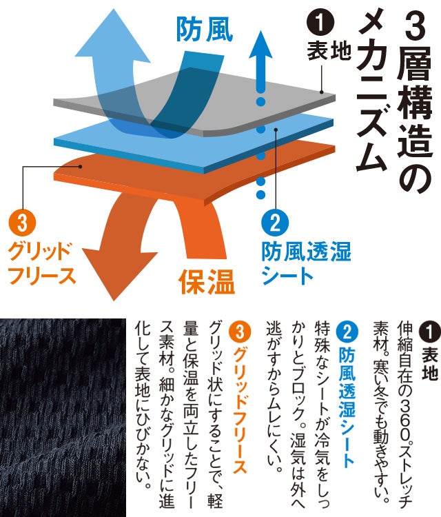 3層構造の防風保温力が支持され、大ヒットとなったゴルフパンツの進化版です。新たに透湿機能を備え、生地も薄く柔らかく、約150g(Lサイズ)軽く進化。動きやすさが向上しました。