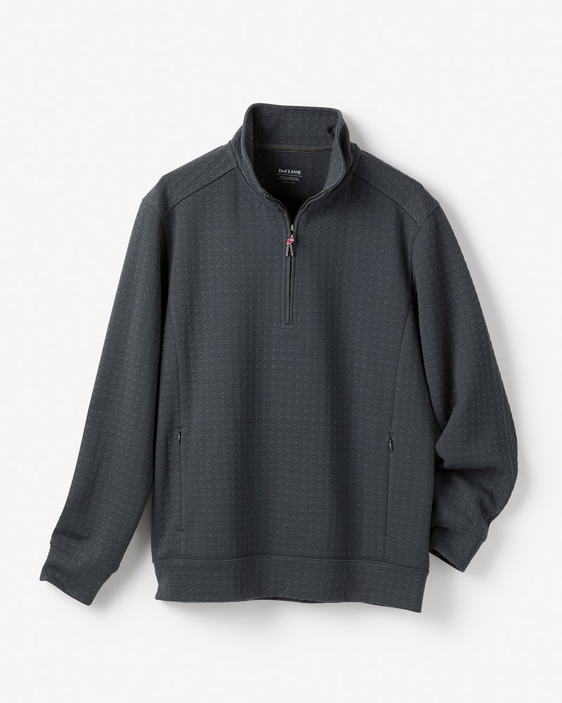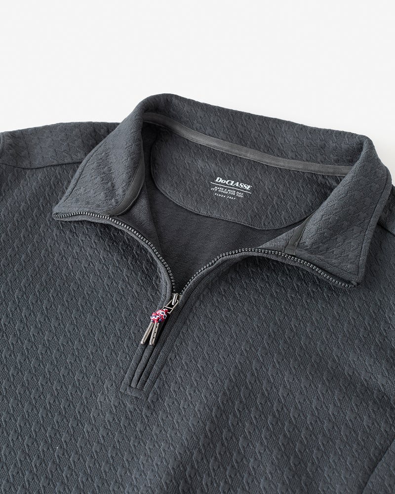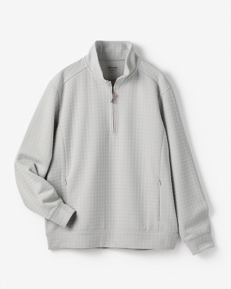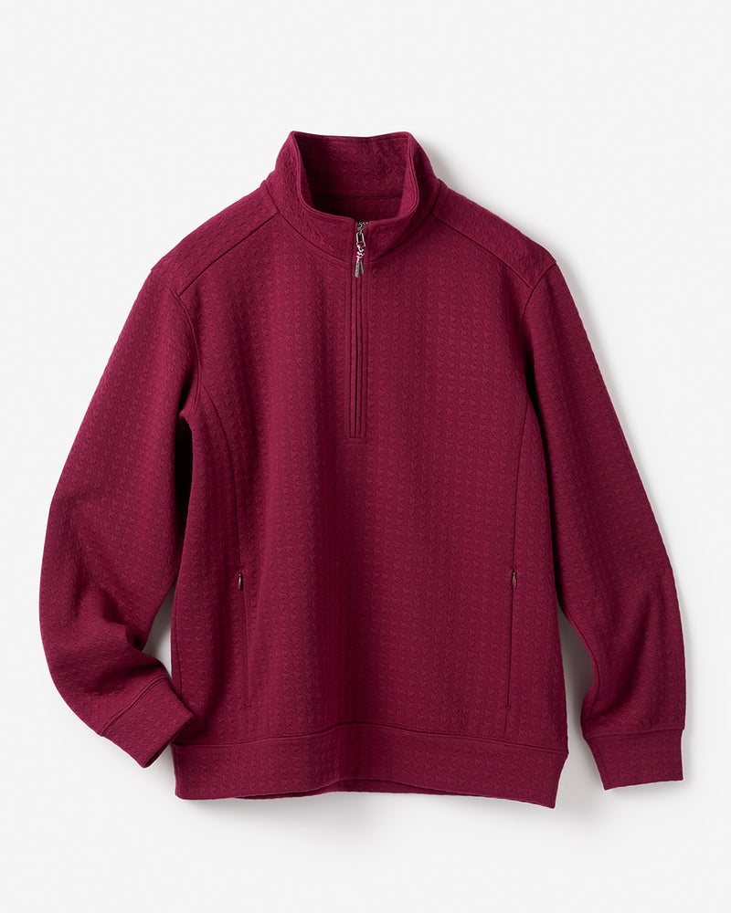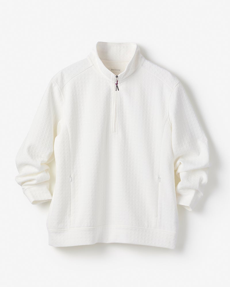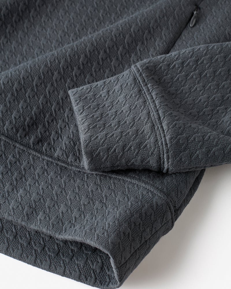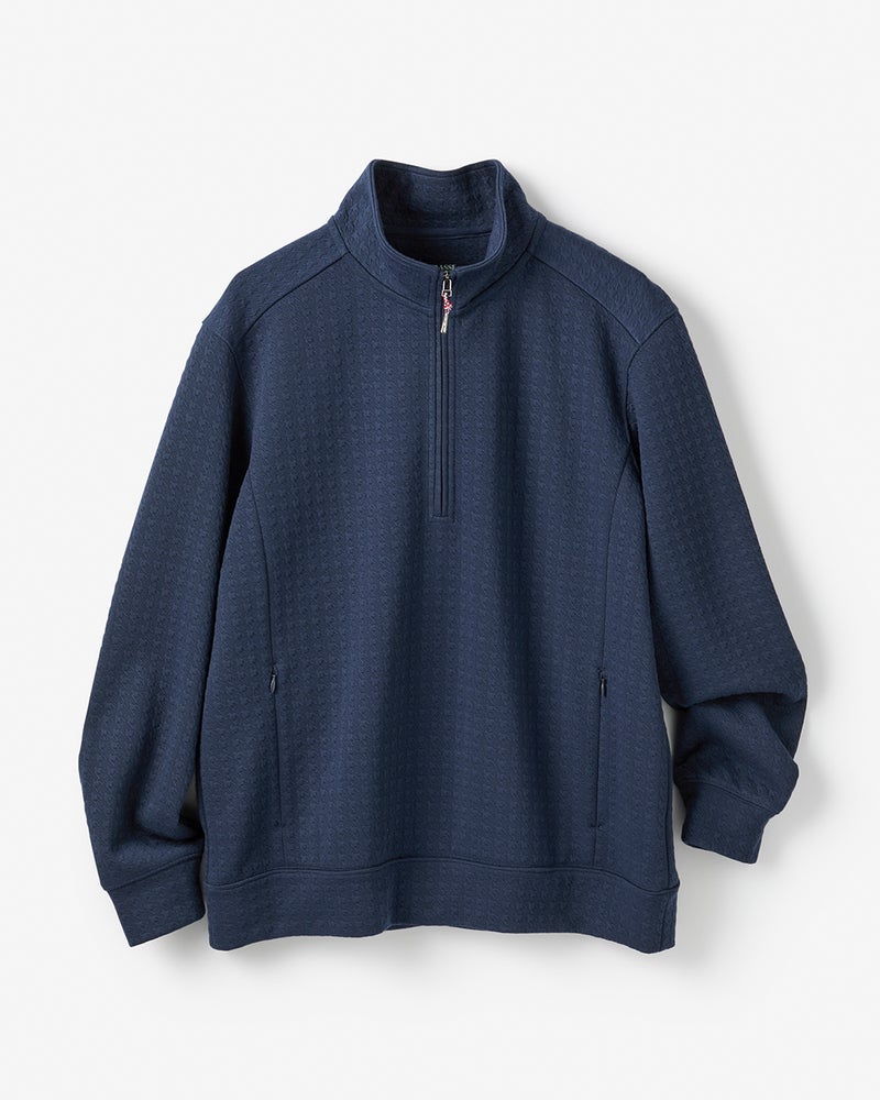 立体的なテクスチャージャガードで表現した千鳥柄のハーフジップ。ドロップショルダーの少しゆとりのある絶妙なシルエットは、体のラインが見えにくく、それでいてウエスト部分はすっきり見えて、体型をカバーします。ストレッチ性もあり、動きやすくて快適です。