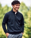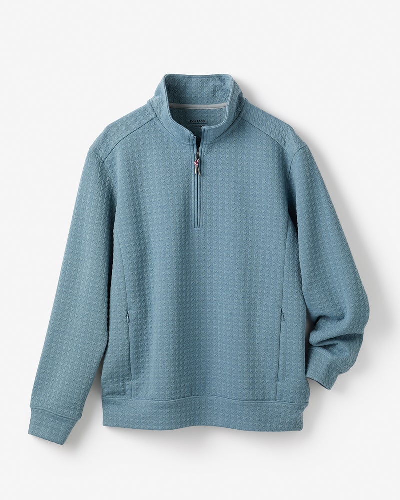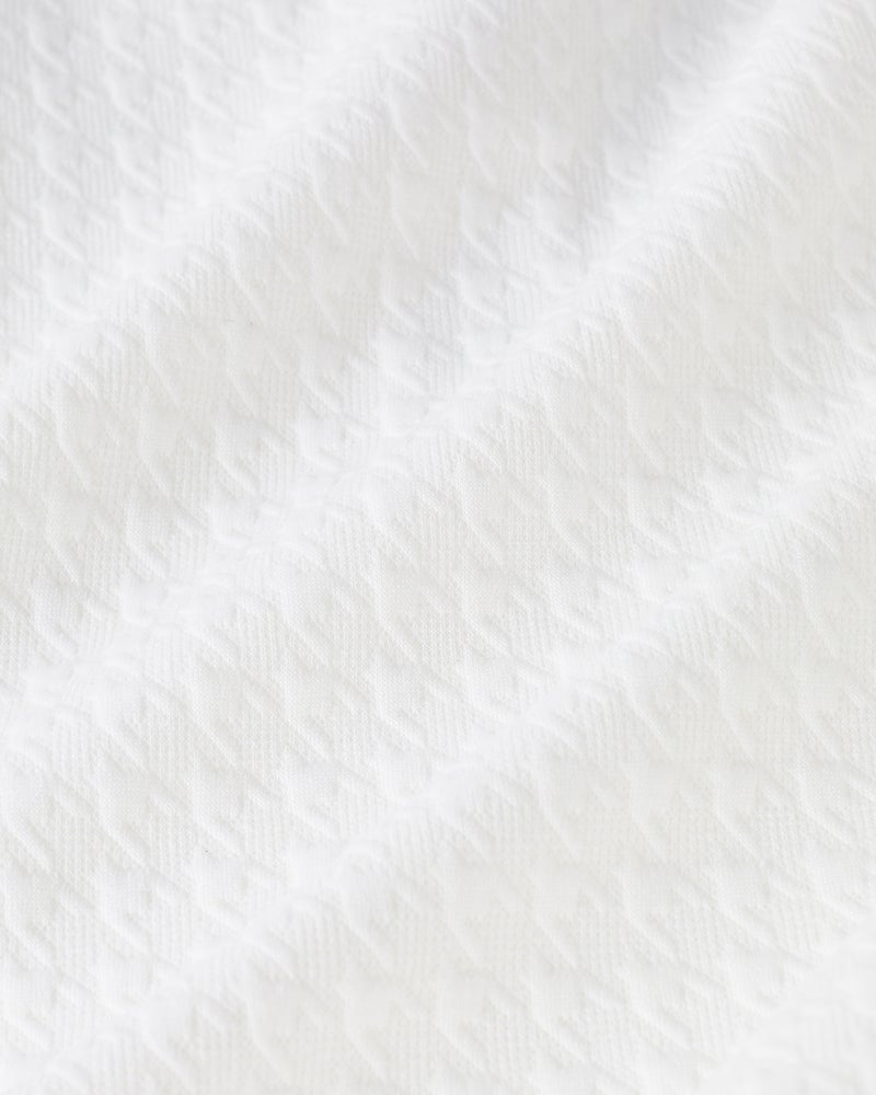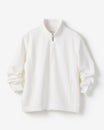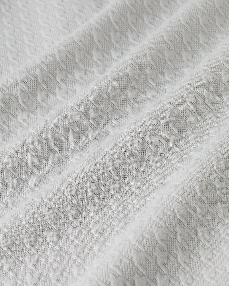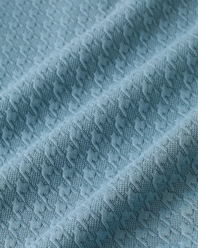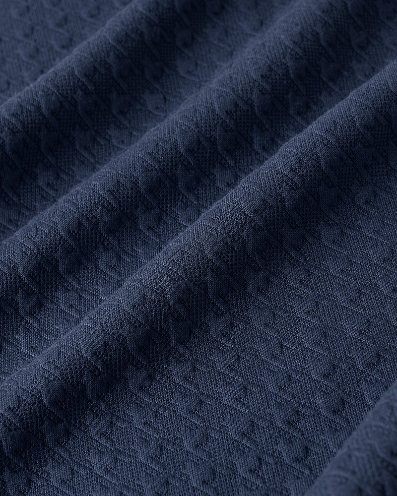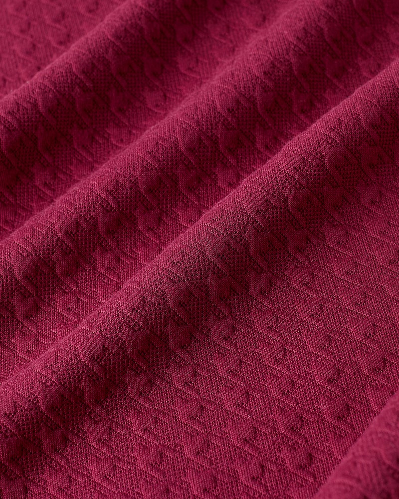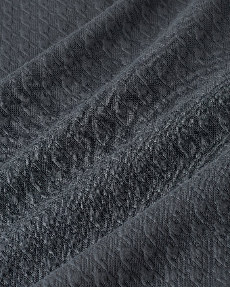 立体的なテクスチャージャガードで表現した千鳥柄のハーフジップ。ドロップショルダーの少しゆとりのある絶妙なシルエットは、体のラインが見えにくく、それでいてウエスト部分はすっきり見えて、体型をカバーします。ストレッチ性もあり、動きやすくて快適です。