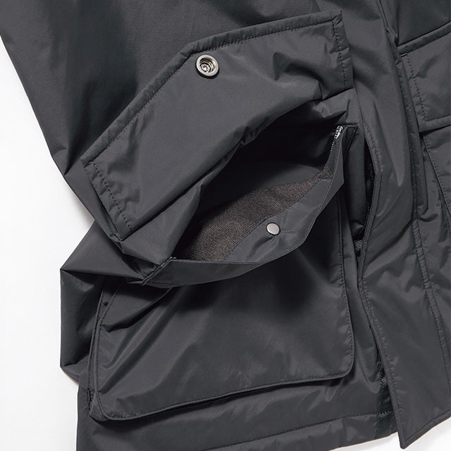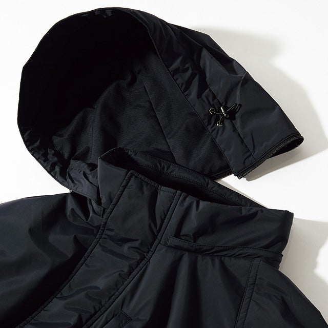 中綿には、衣服内を快適な温度と湿度に保つ「37.5テクノロジー」を搭載。その中綿を身頃に入れる分量は何度も検証して、保温性はしっかりと確保しつつ、着ぶくれしないすっきりシルエットを実現。表地は雨をはじく撥水性と、動きやすく快適なストレッチ性を備えています。