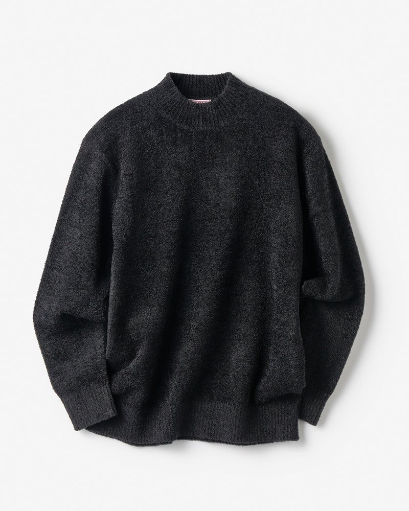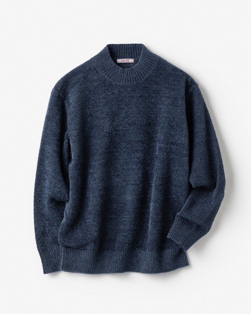 ポリエステル、アクリル、ナイロンの混紡モール糸で編み立てた、ハイネックニット。3つの素材を絶妙に配合することで、毛玉ができにくく、チクチク感もなく、洗濯後の型崩れも解消。もちっと柔らかな独特の触感。保温性に優れ、ストレッチが効いた快適な着心地です。