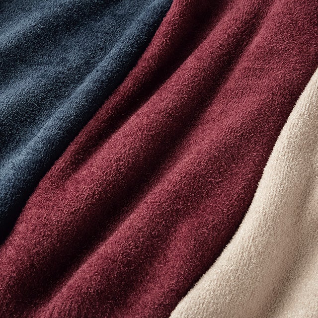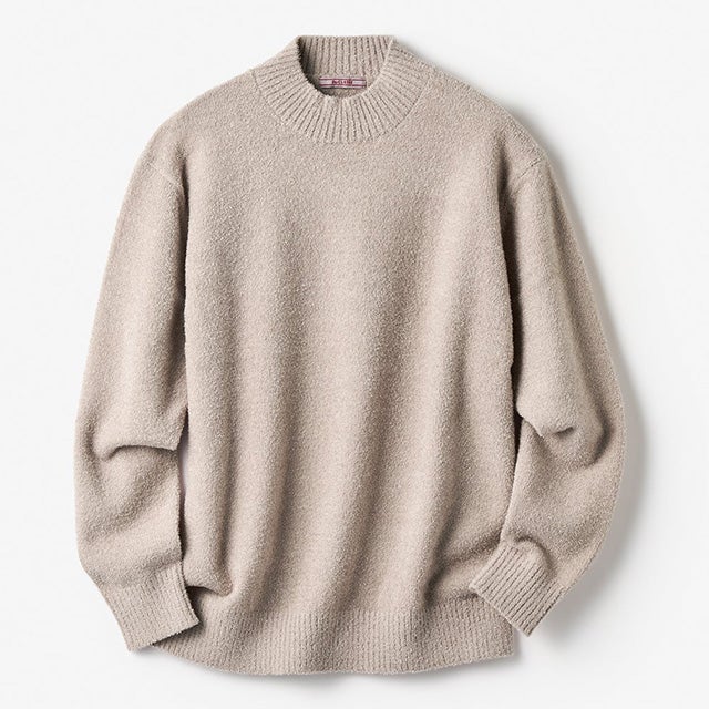 ポリエステル、アクリル、ナイロンの混紡モール糸で編み立てた、ハイネックニット。衿高はほどよい5.5㎝。毛玉ができにくく、チクチク感もなく、洗濯後の型崩れも解消。ストレッチが効いた快適な着心地です。