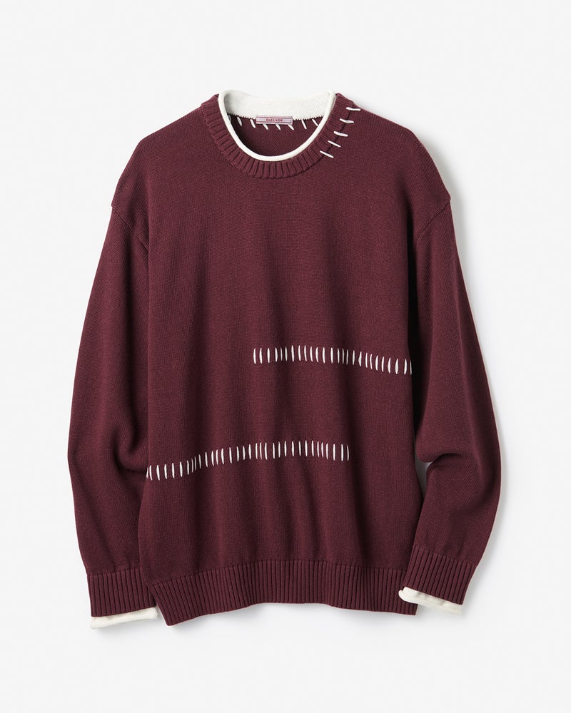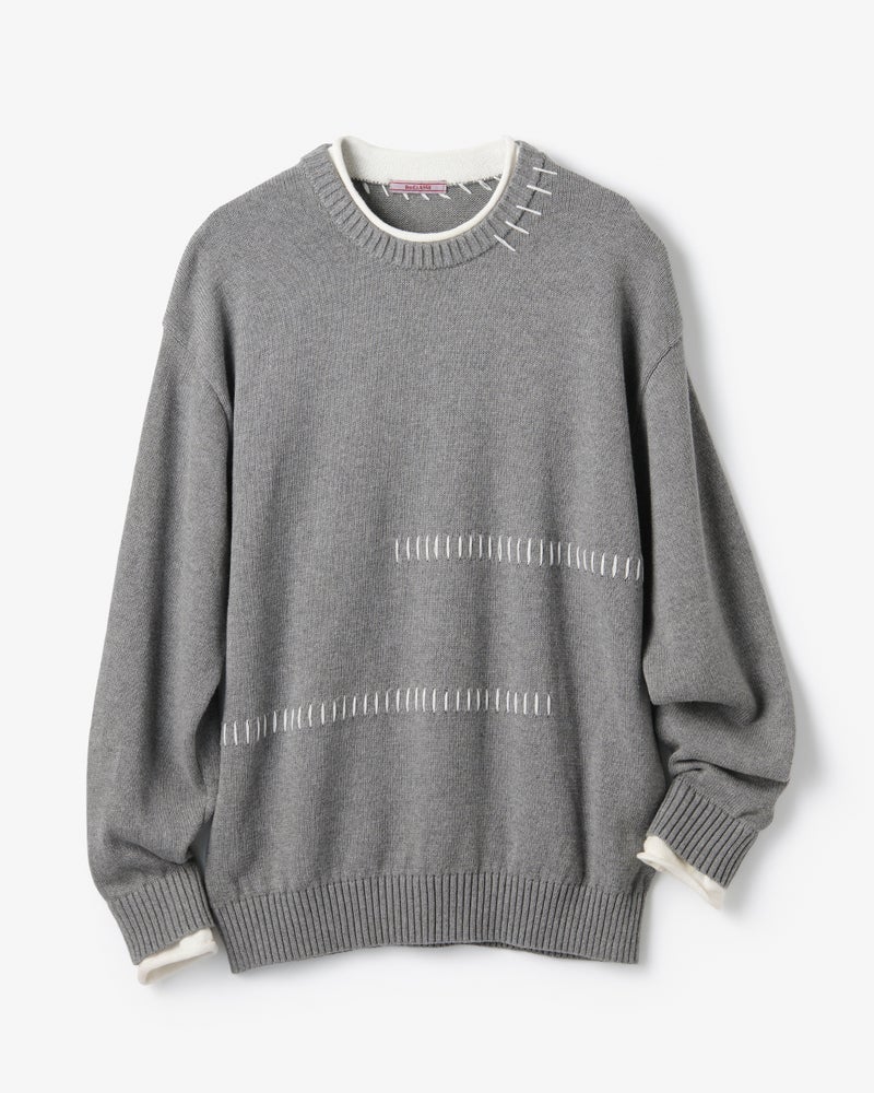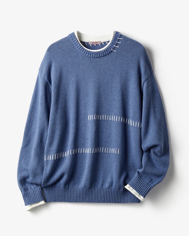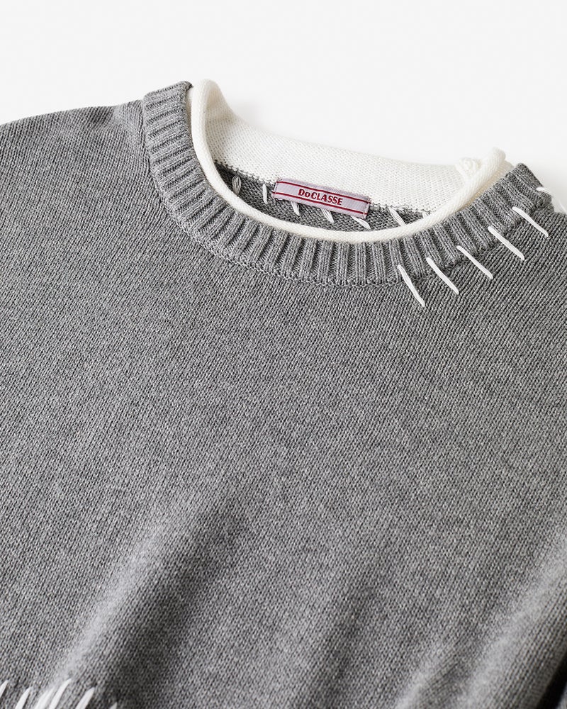 リラックスフィットのクルーネックセーターを、カシミヤ混の贅沢な素材で仕立てました。柔らかな肌触りは、毎日着たくなるほど。衿と袖口の内側にあしらった配色生地がチラリと見える重ね着風。衿周りと前後の身頃には遊び心のあるハンドステッチ。これ1枚着るだけでコーディネートが簡単に完成します。