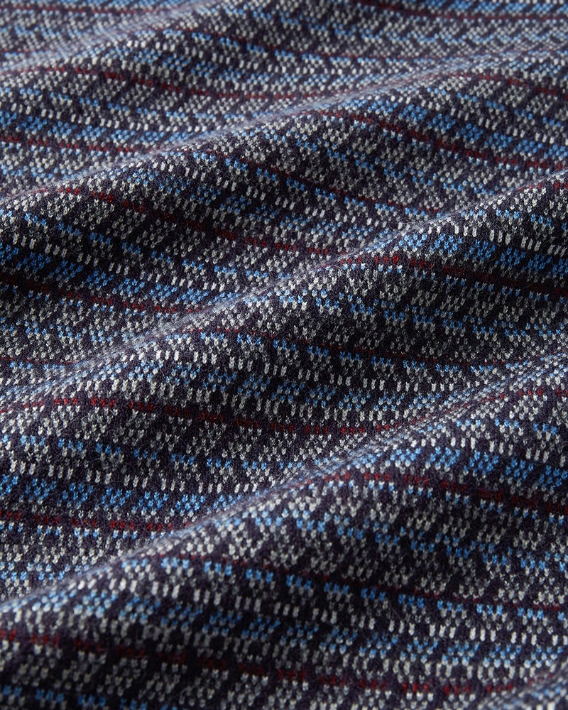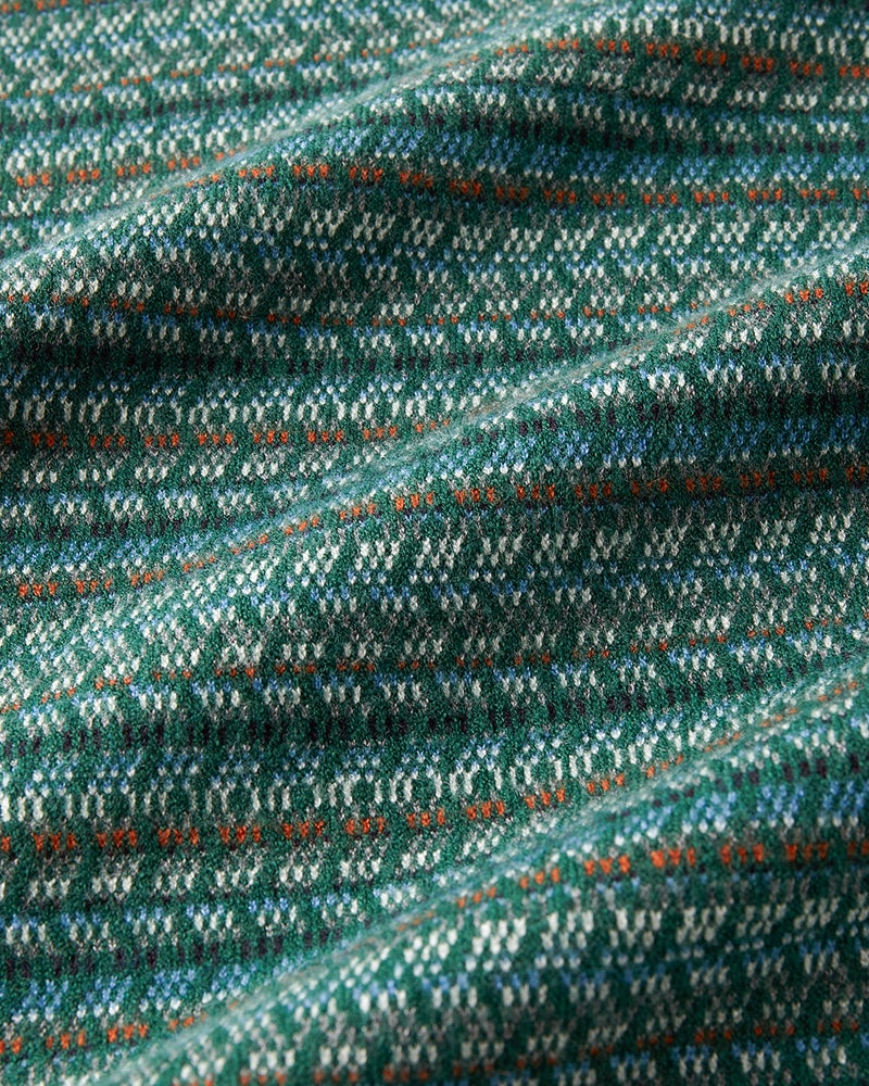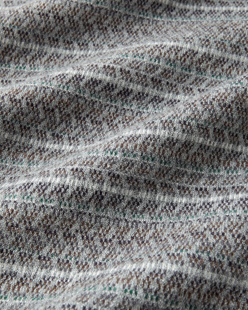 12ゲージという細かなジャカード編みで描いた幾何学模様。1枚で着てサマになる主役級ニット。ジャケットやアウターのインナーとして着ても、柄が効いて着こなしのアクセントになります。ほどよくハリのあるソフトな風合いで、心地よい肌触りです。