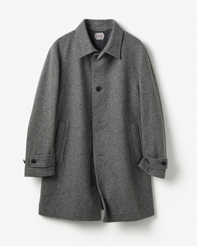 台衿が付いた上品な印象のステンカラー。平織りのウール混生地に起毛をかけた質感は、柔らかで温もりがあります。両腰ポケットは、フォーマル感があり手を入れやすい箱ポケットです。