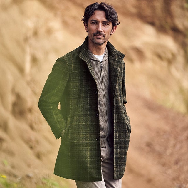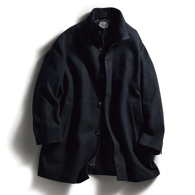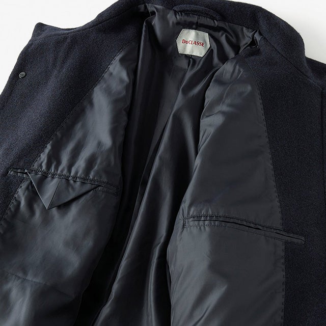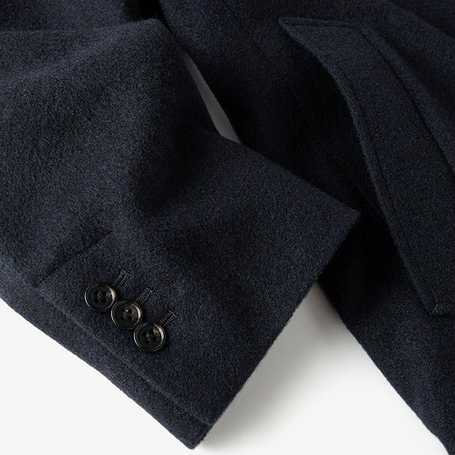 衿がしっかりと立つスタンドカラーは、上品かつ男らしい印象を演出します。平織りのウール混生地に起毛をかけた質感は、柔らかで温もりがあります。前立てはボタンが隠れる比翼仕立てで、両腰ポケットはフォーマルな箱ポケットです。