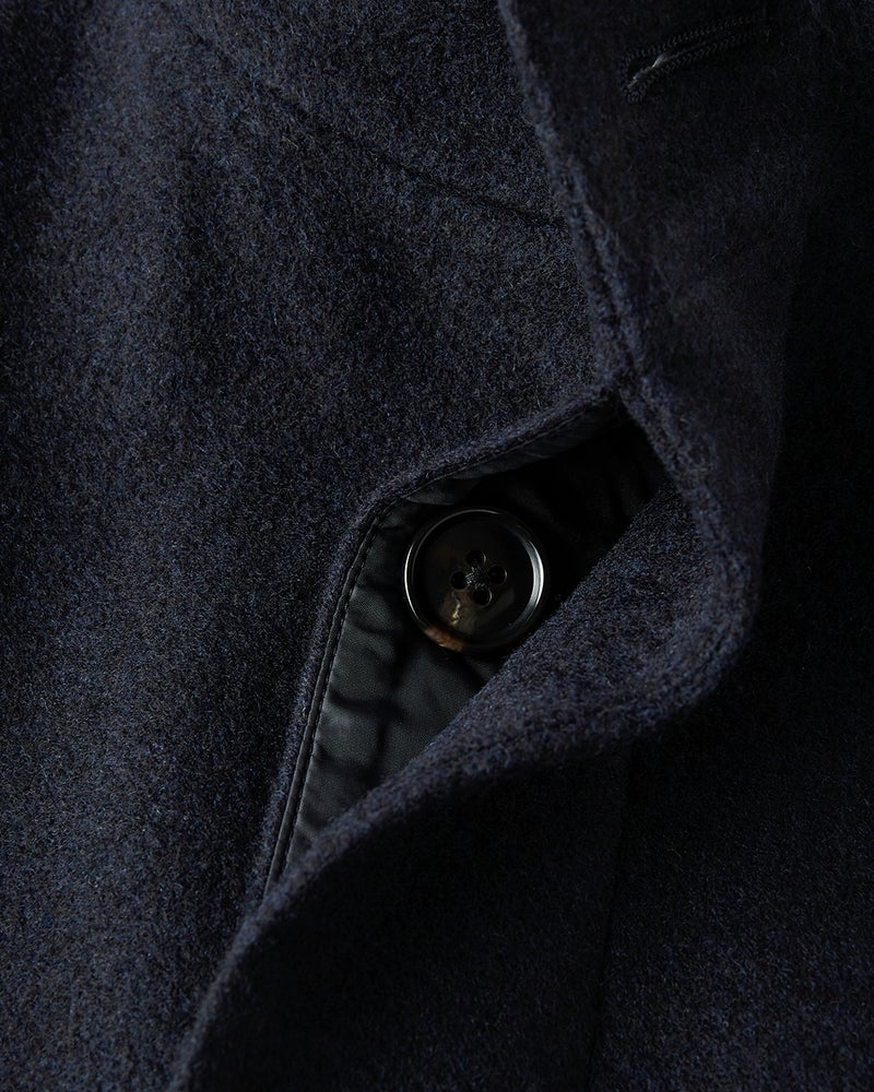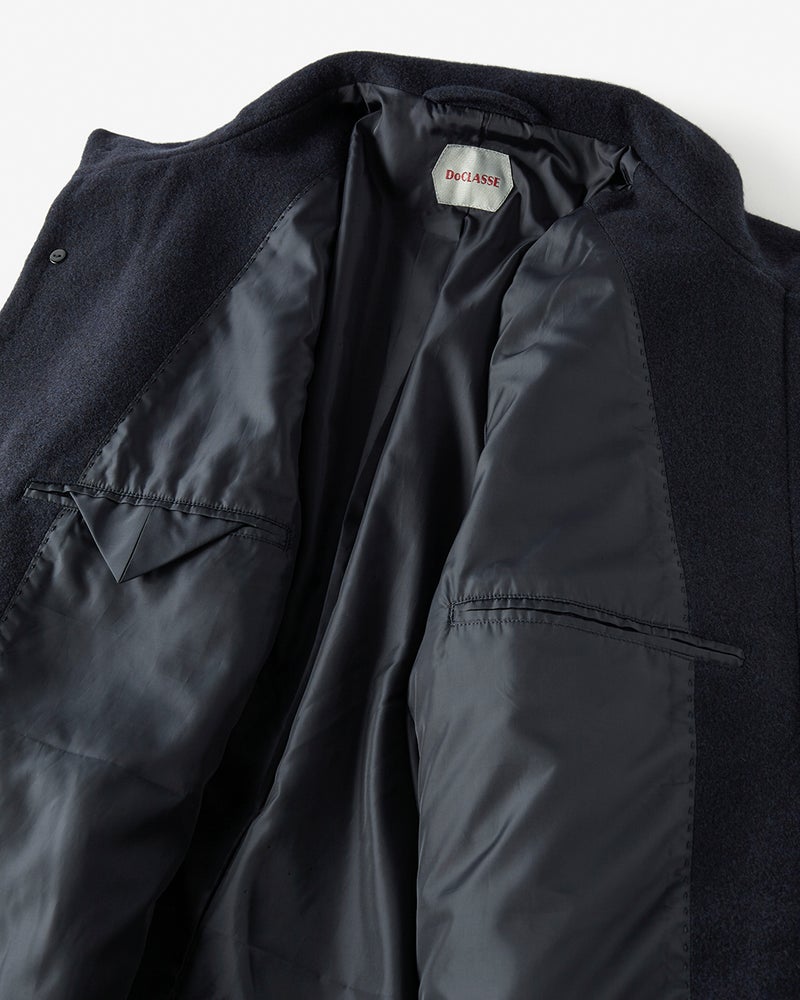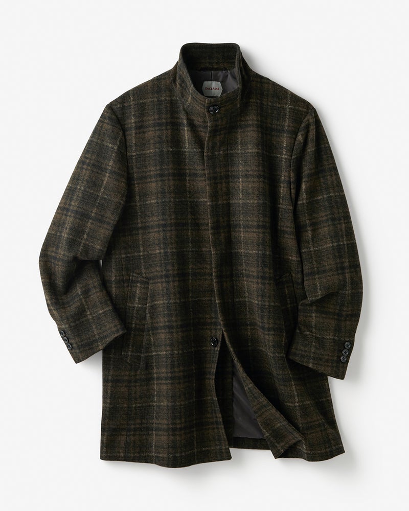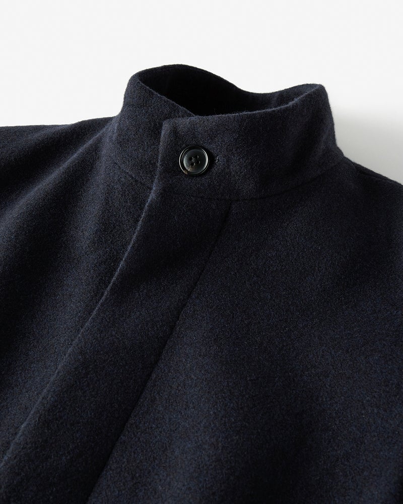 - 軽量なウール混のスタンドカラーコート。平織りの生地に起毛をかけた生地の質感は、柔らかで温もりがあります。ウール混ならではの保温性と吸湿性で、暖かくムレにくい。防シワ性もあり、長時間着用してもシワになりにくい。衿がしっかりと立つスタンドカラーは、上品かつ男らしい印象を演出します。